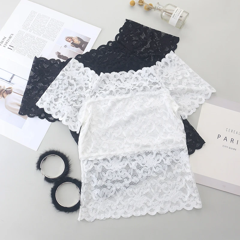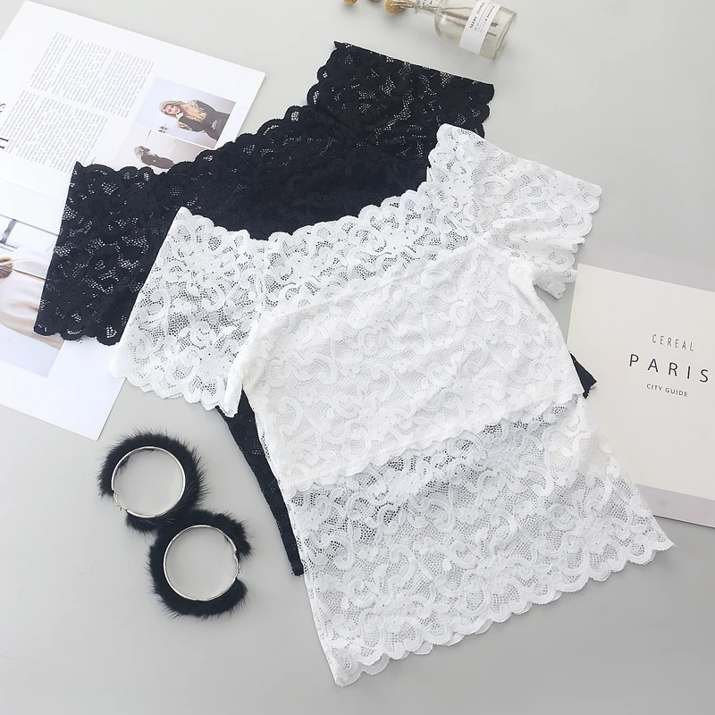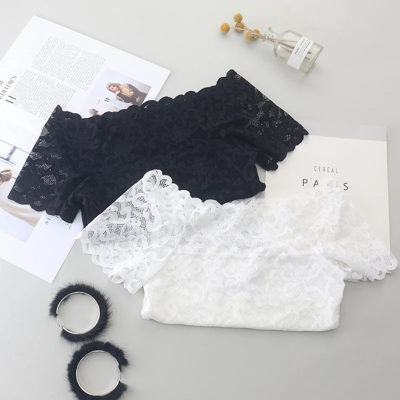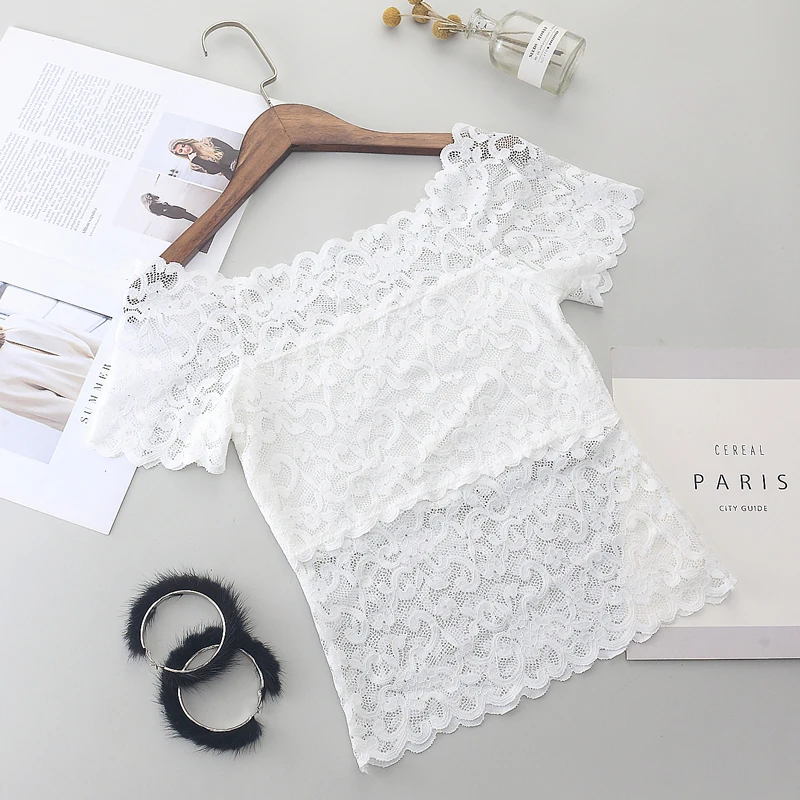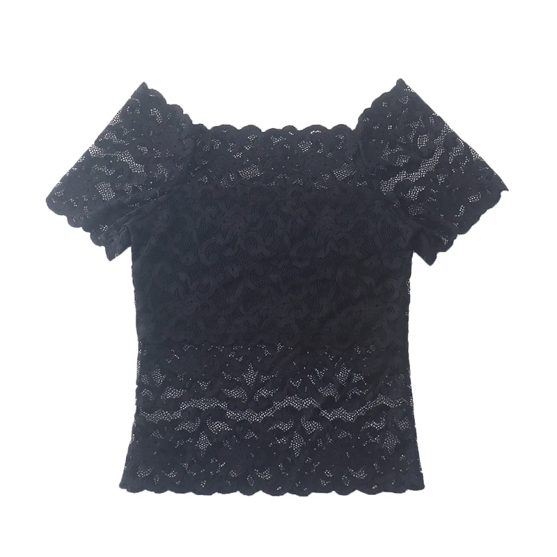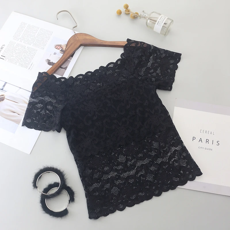 1piece Wommen Sexy Lace Off Shoulder Crop Tops With Bra Short Sleeve Bare Shoulder Crochet Top Female Cotton T-Shirt Lace