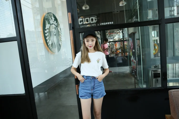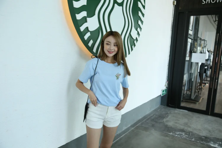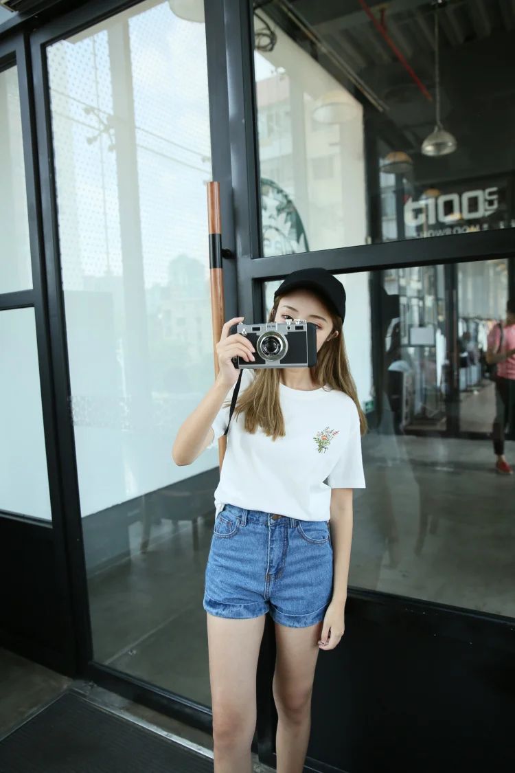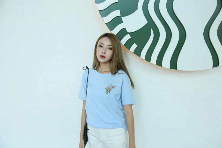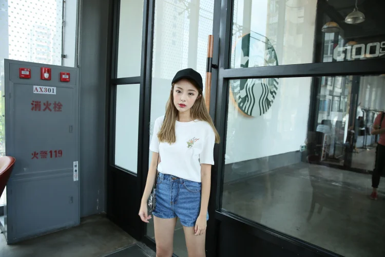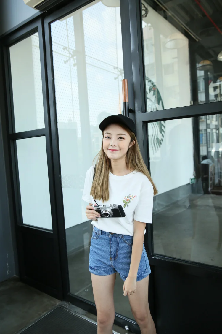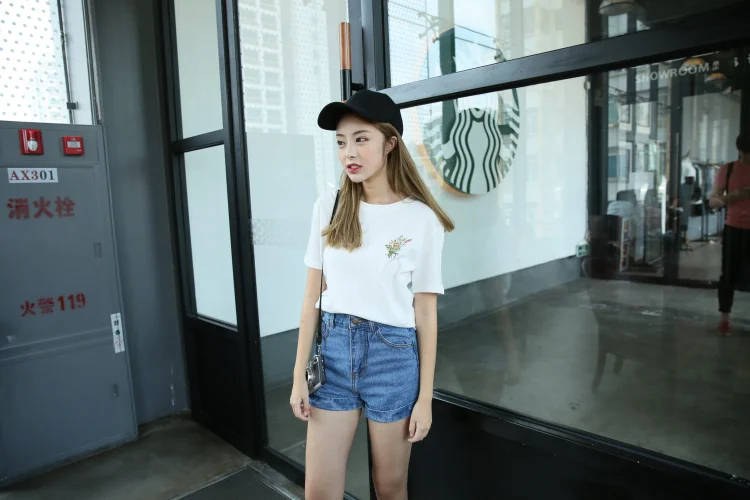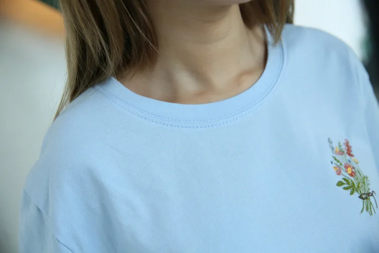 Summer Little Flower Emboridered Fresh Basic Loose Casual Short Sleeve Female T-shirt
