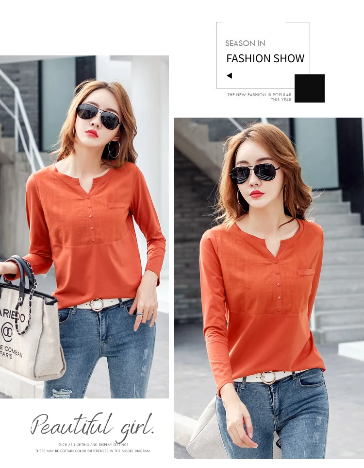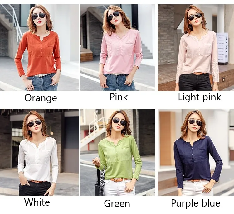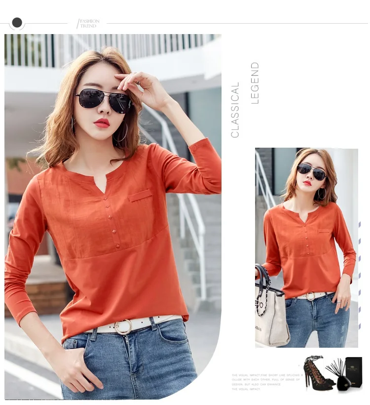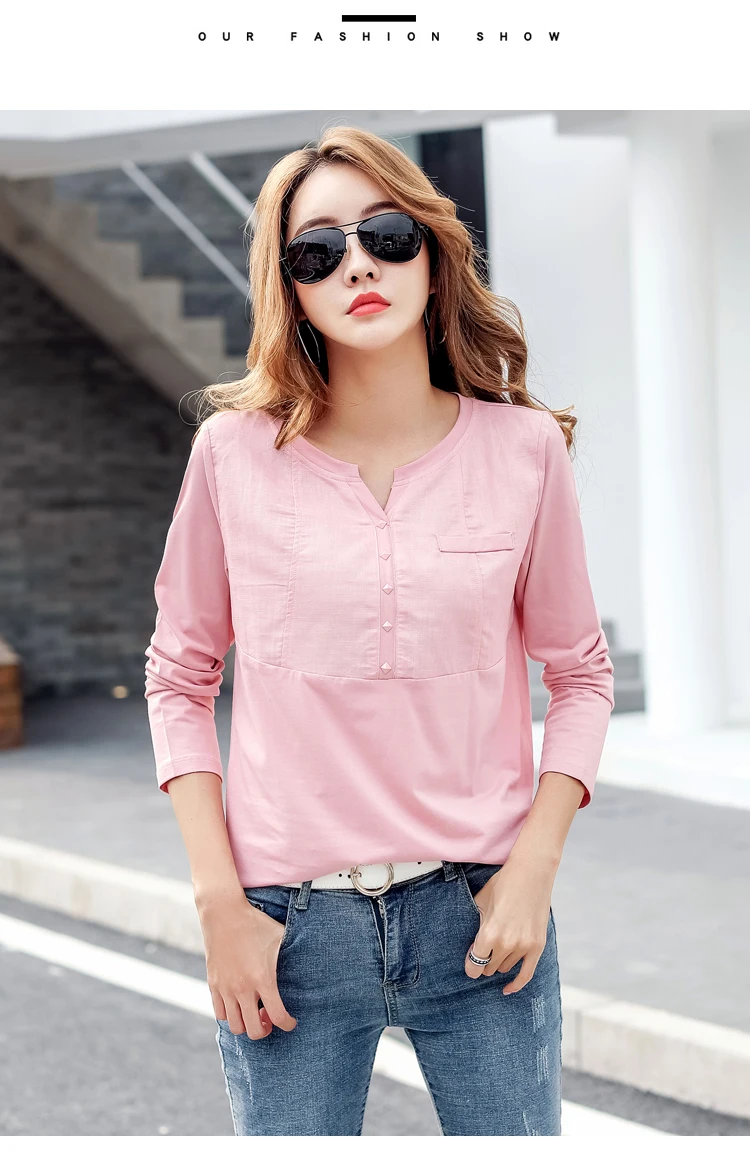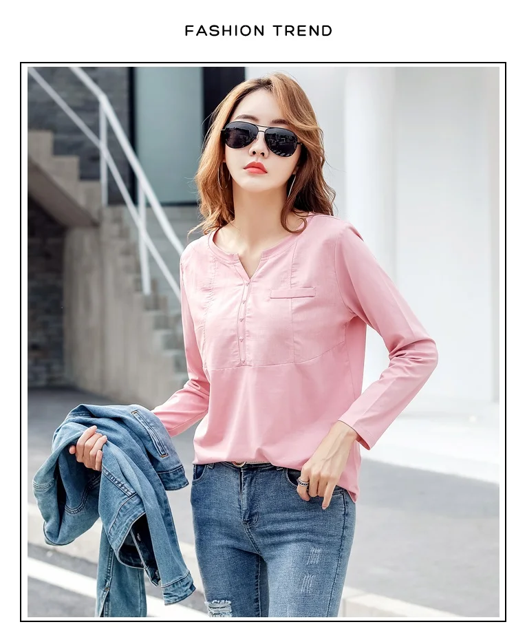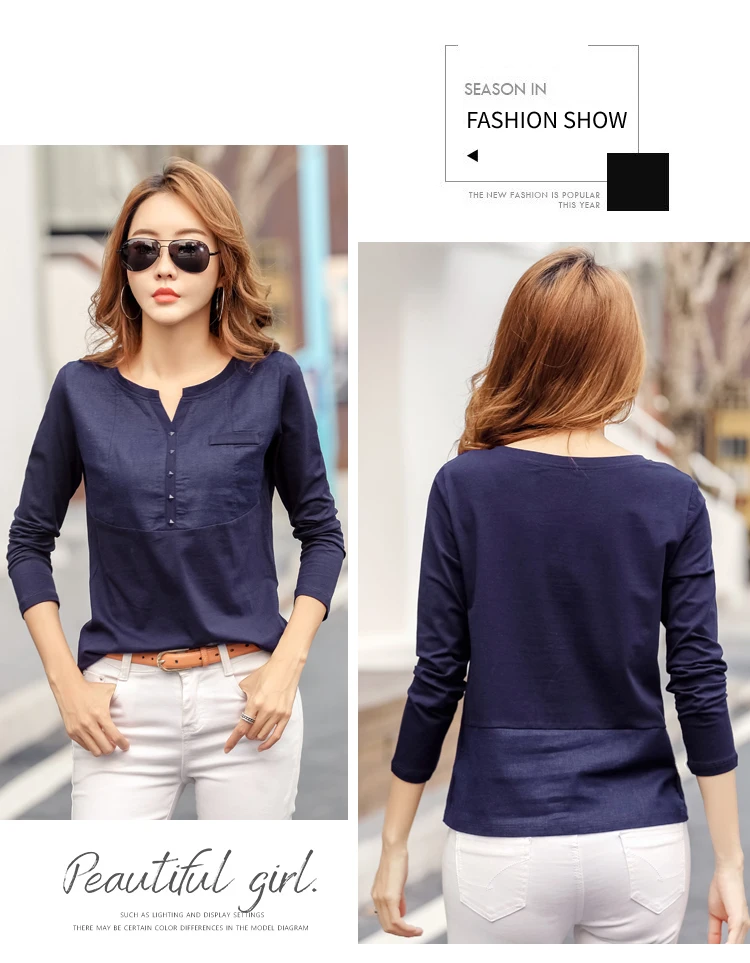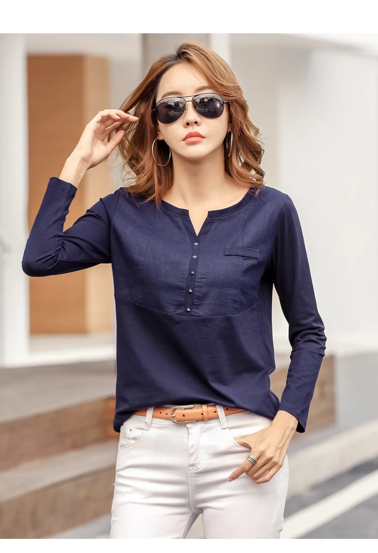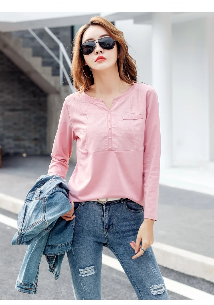 Autumn Female 2021 Slub cotton V-neck Long sleeve T-shirt Women Gem buttons Navy blue Tops Fashion stitching Pink orange T shirt