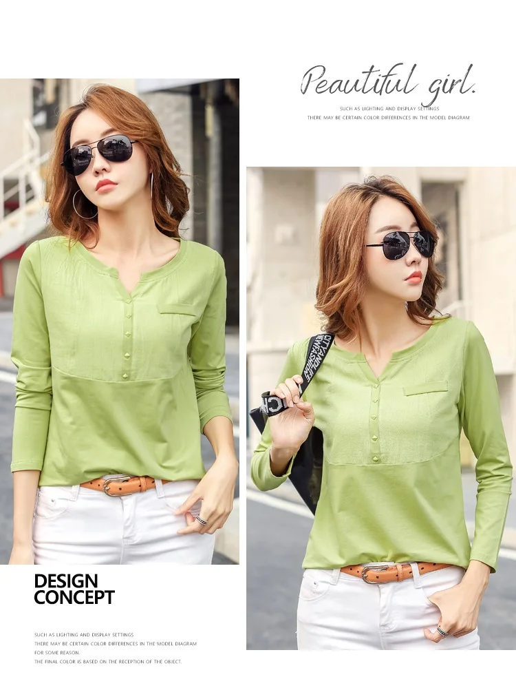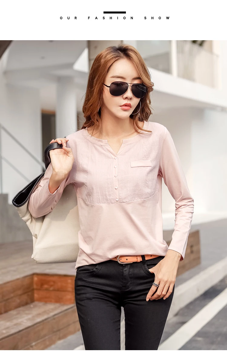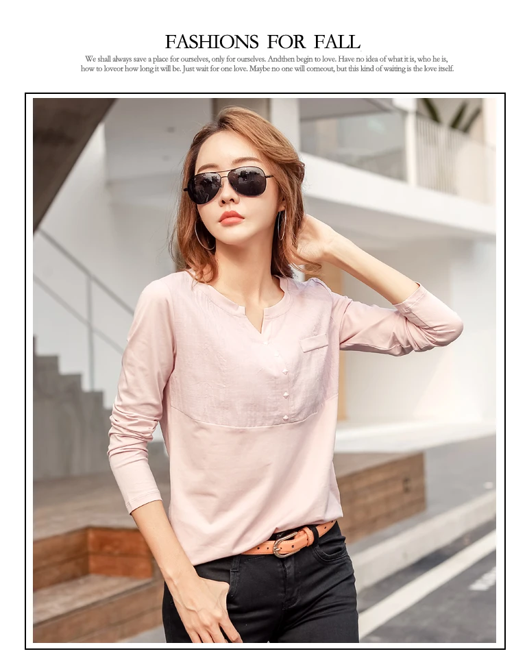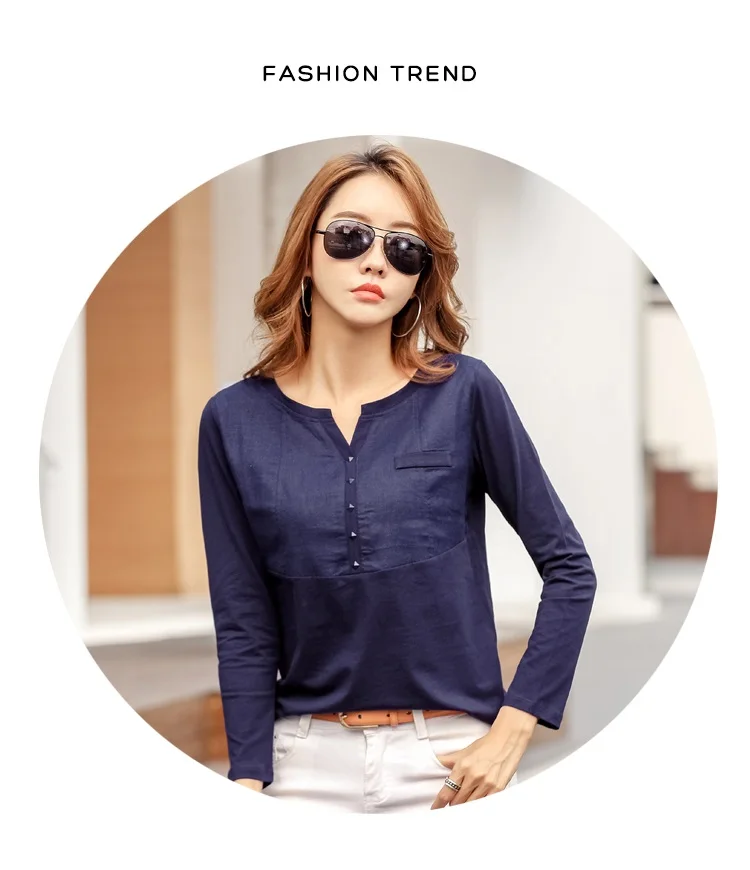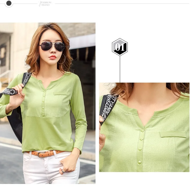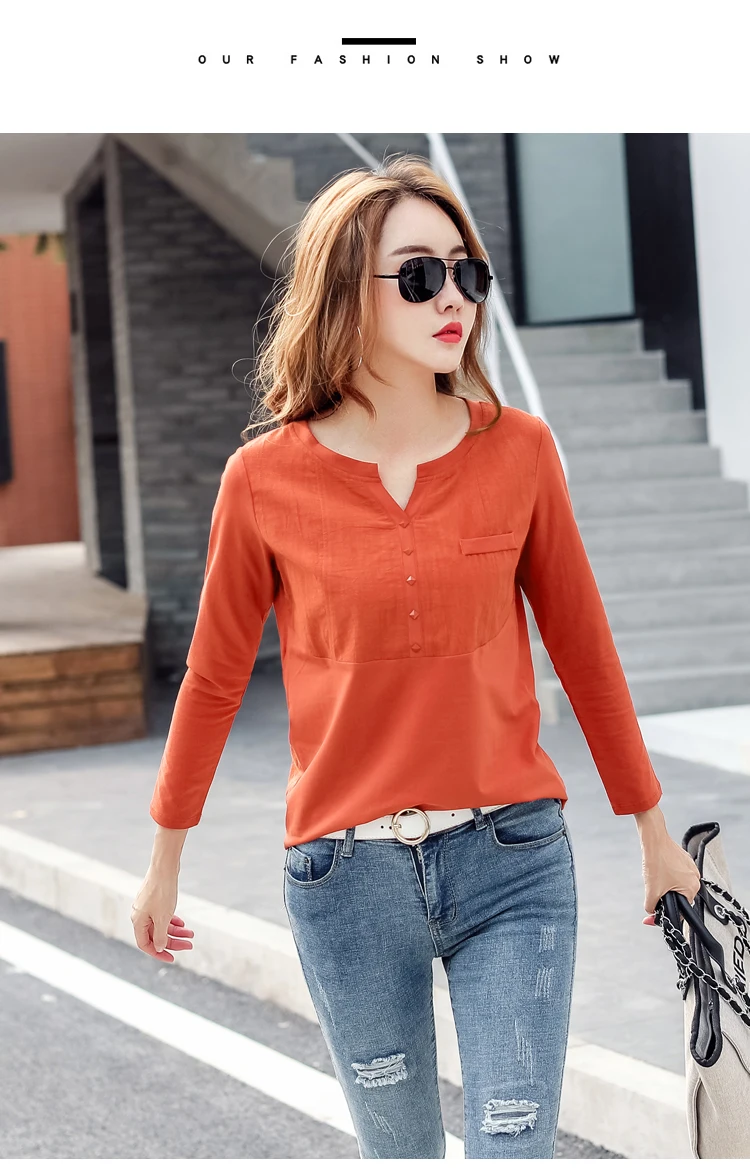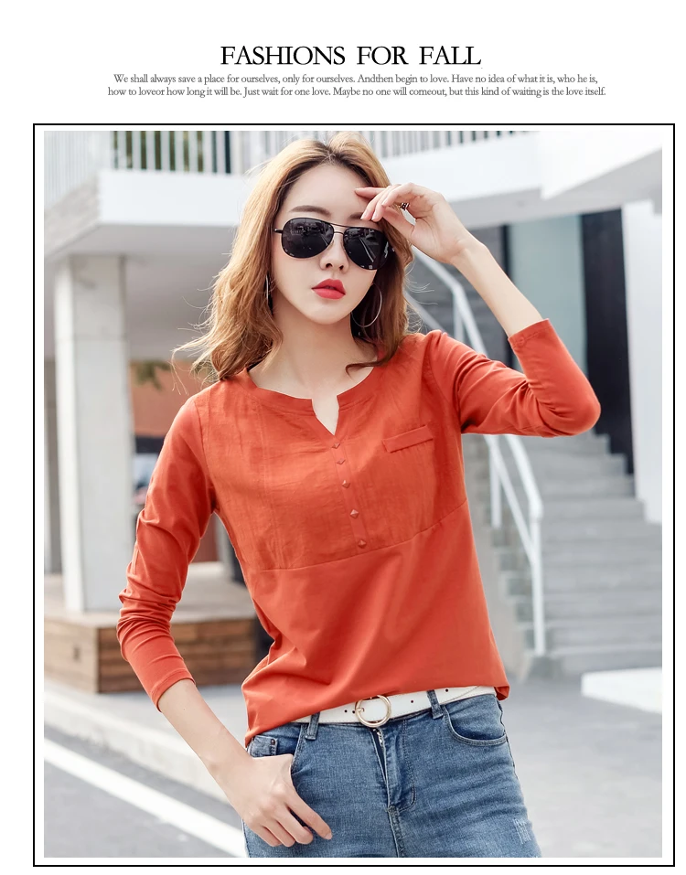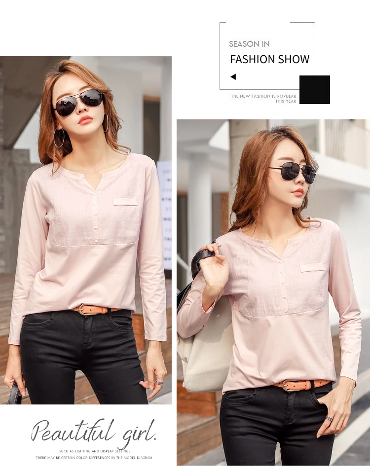 Autumn Female 2021 Slub cotton V-neck Long sleeve T-shirt Women Gem buttons Navy blue Tops Fashion stitching Pink orange T shirt