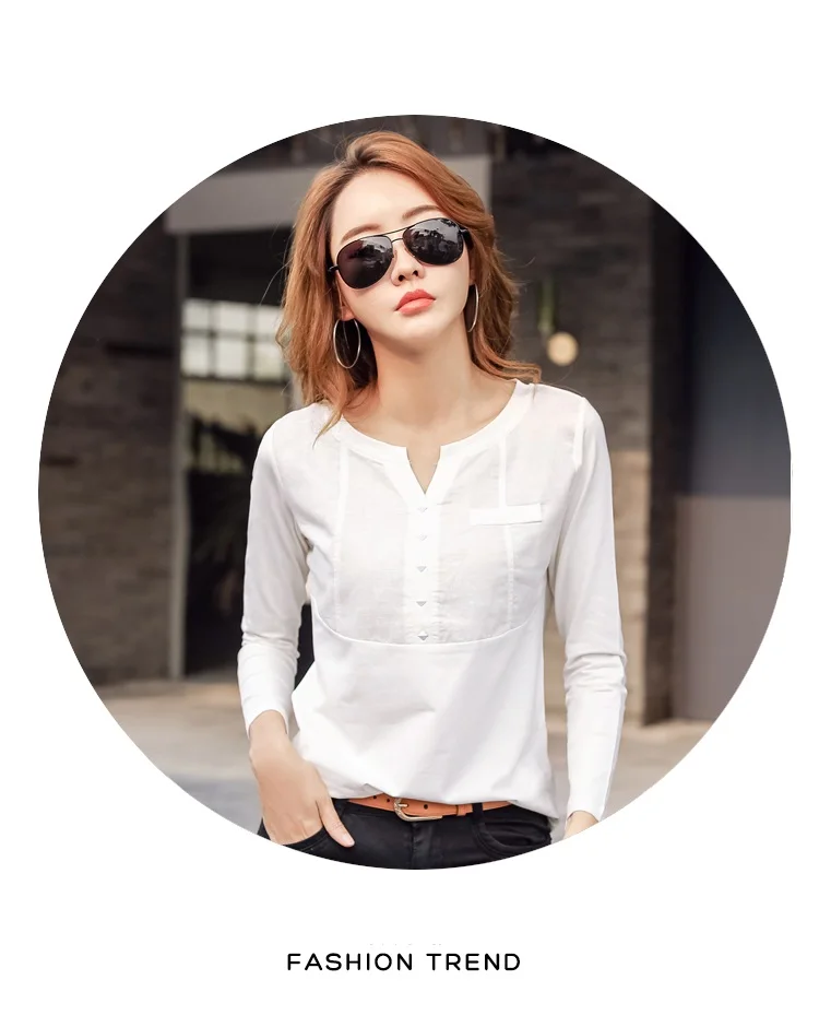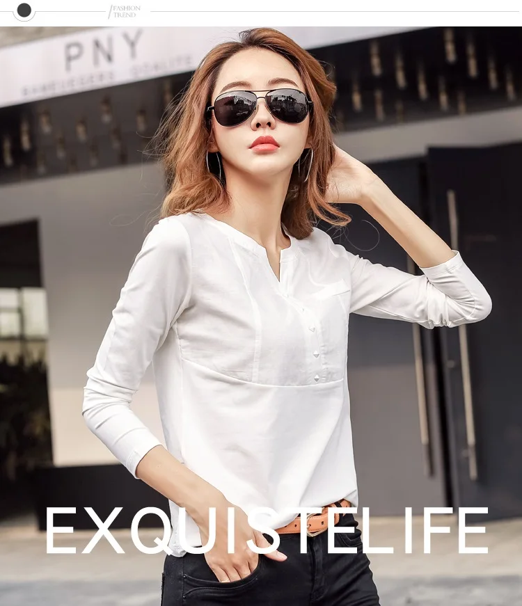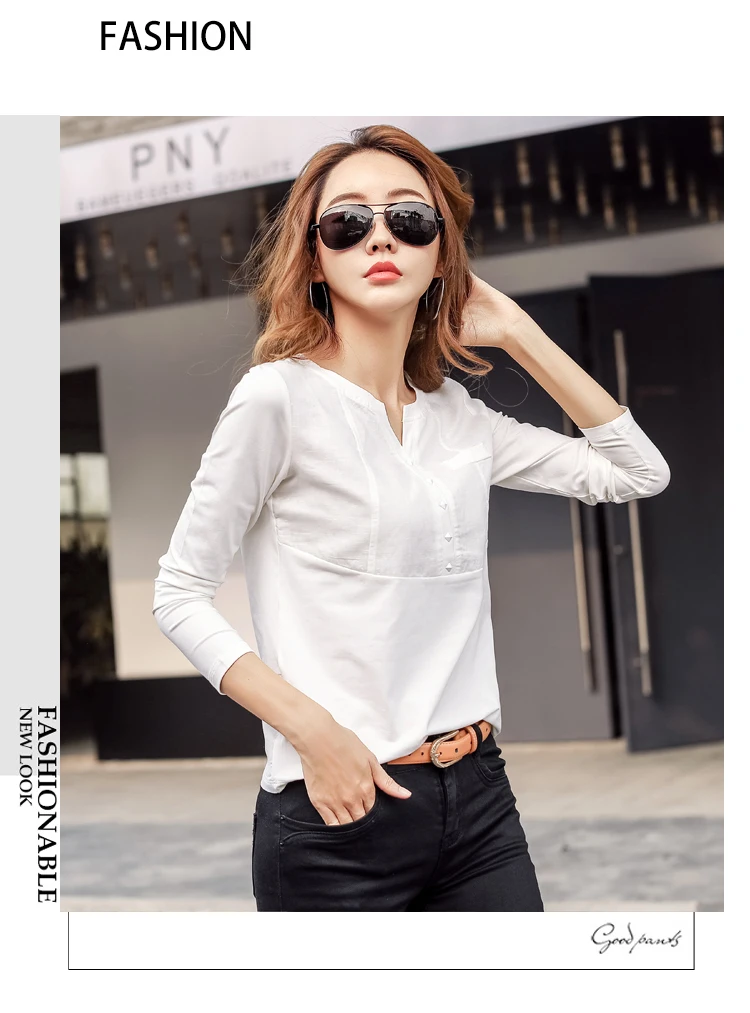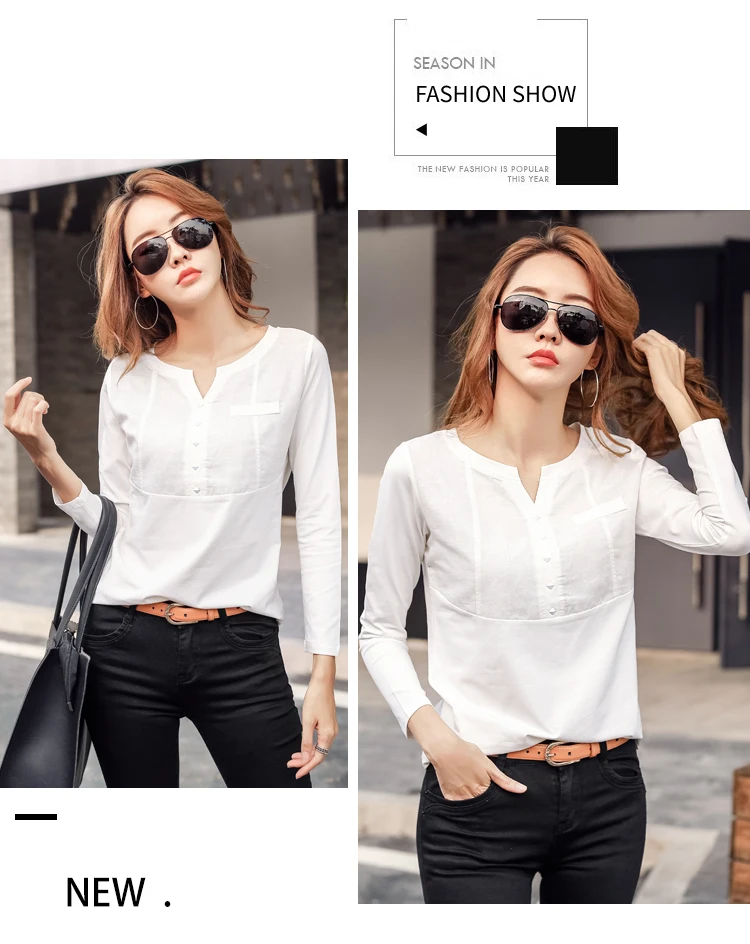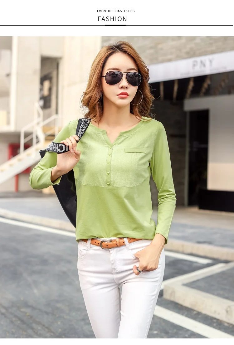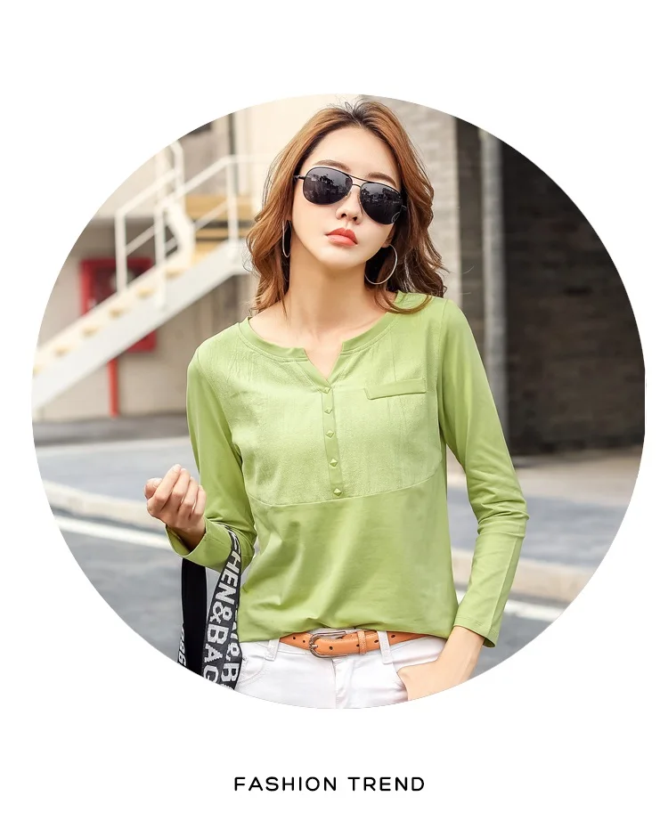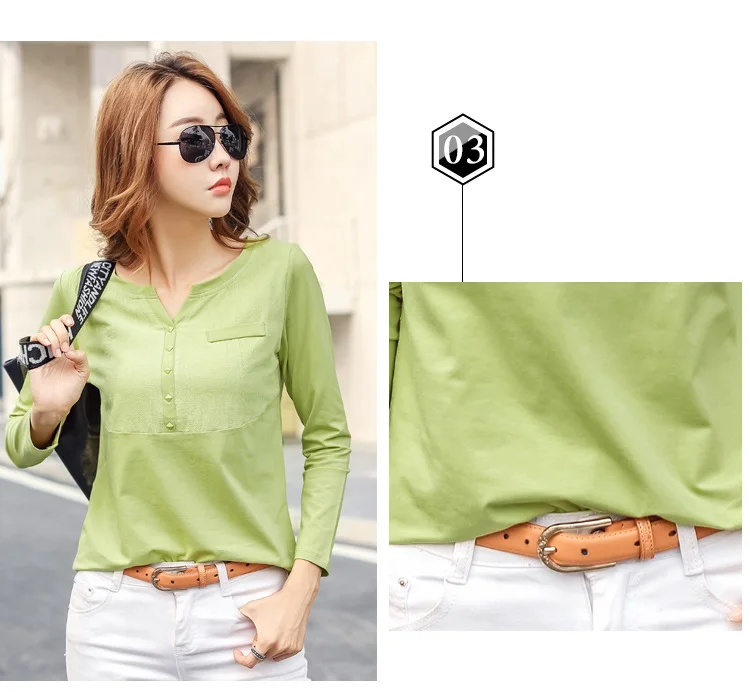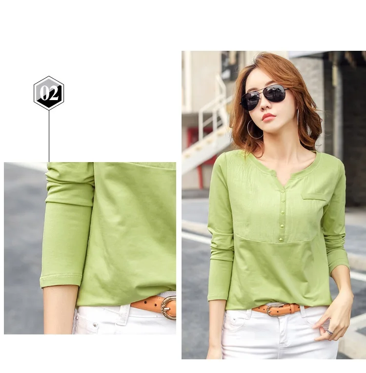Autumn Female 2021 Slub cotton V-neck Long sleeve T-shirt Women Gem buttons Navy blue Tops Fashion stitching Pink orange T shirt