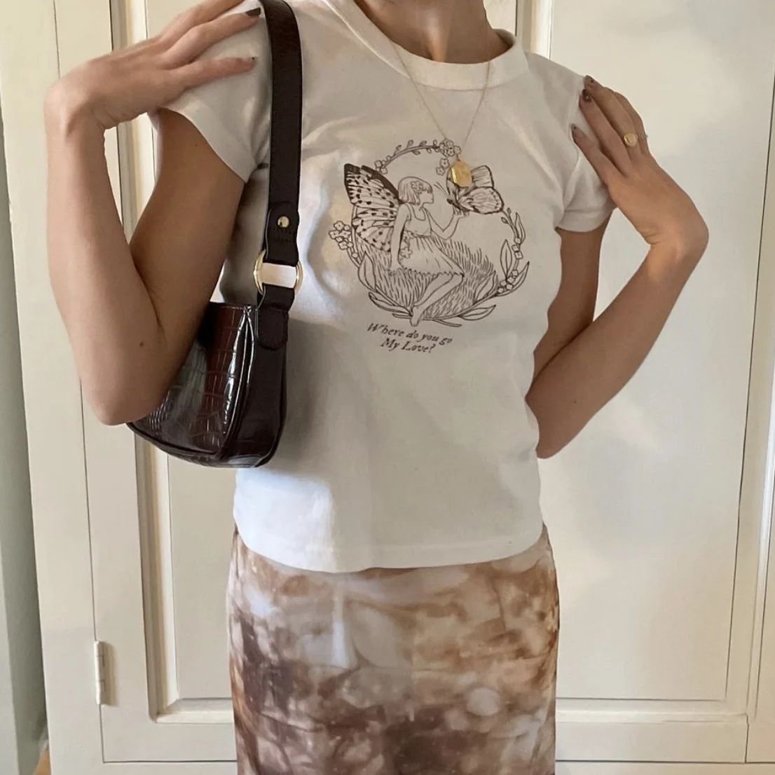 Butterfly Fairy Vintage Crop Top Women Summer Short Sleeve O Neck Harajuku Cotton Y2k Tops Female Casual Sexy Slim T Shirt
