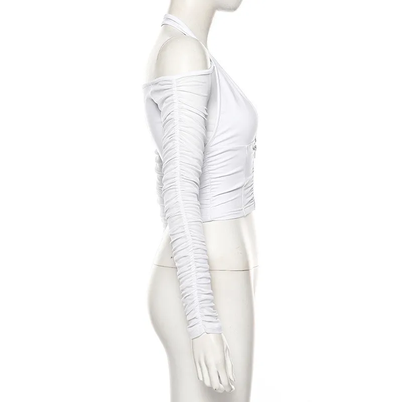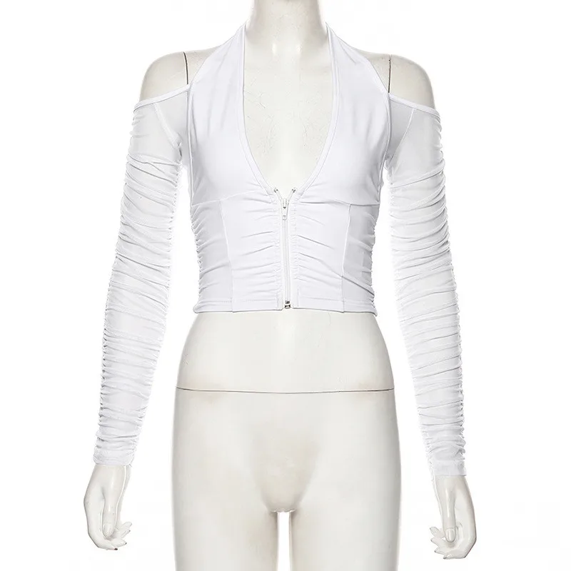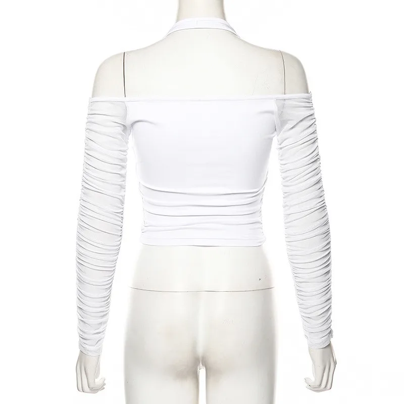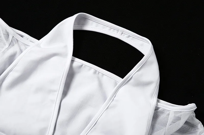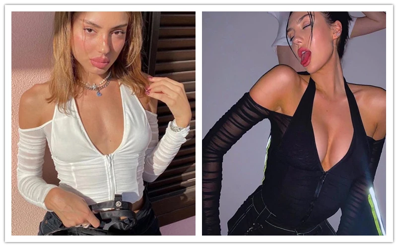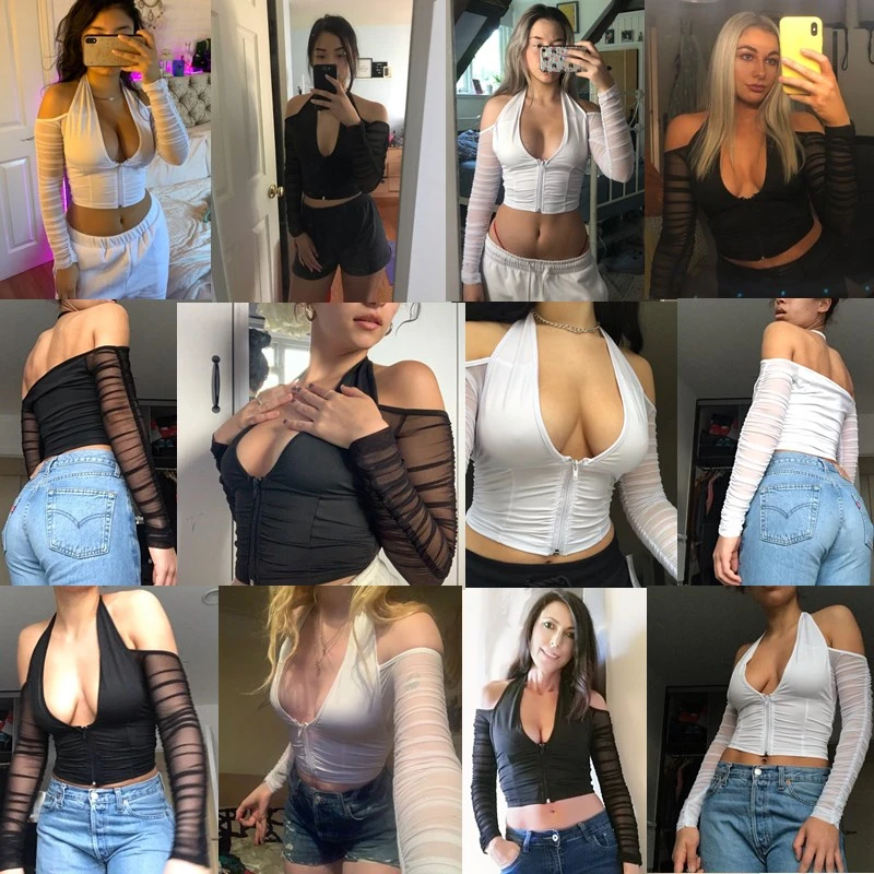 CNYISHE 2020 Fashion Mesh Shirt Women Tshirt Top Autumn Halter V-neck Off the Shoulder T-shirts Female Sexy Solid Streetwear Top