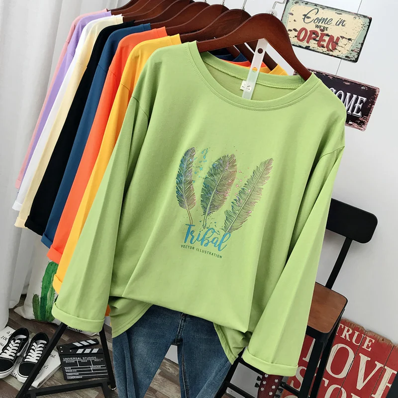 Plus Size Spring fashion Casual women Long sleeve T-shirt loose 100% cotton Soft Pullover Harajuku Feather print Tops