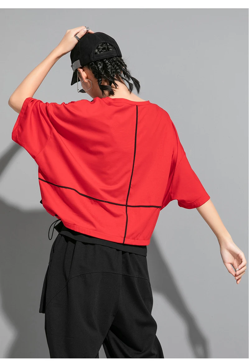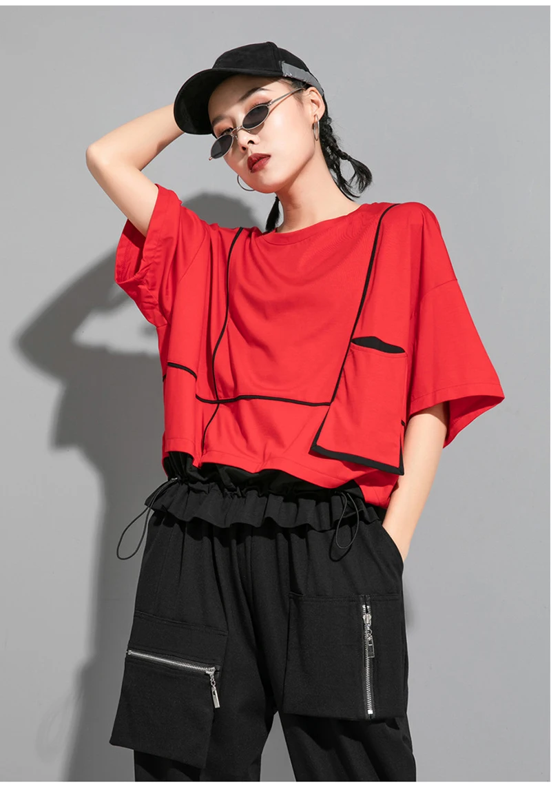 Women Red Pocket Split Joint Big Size T-shirt New Round Neck