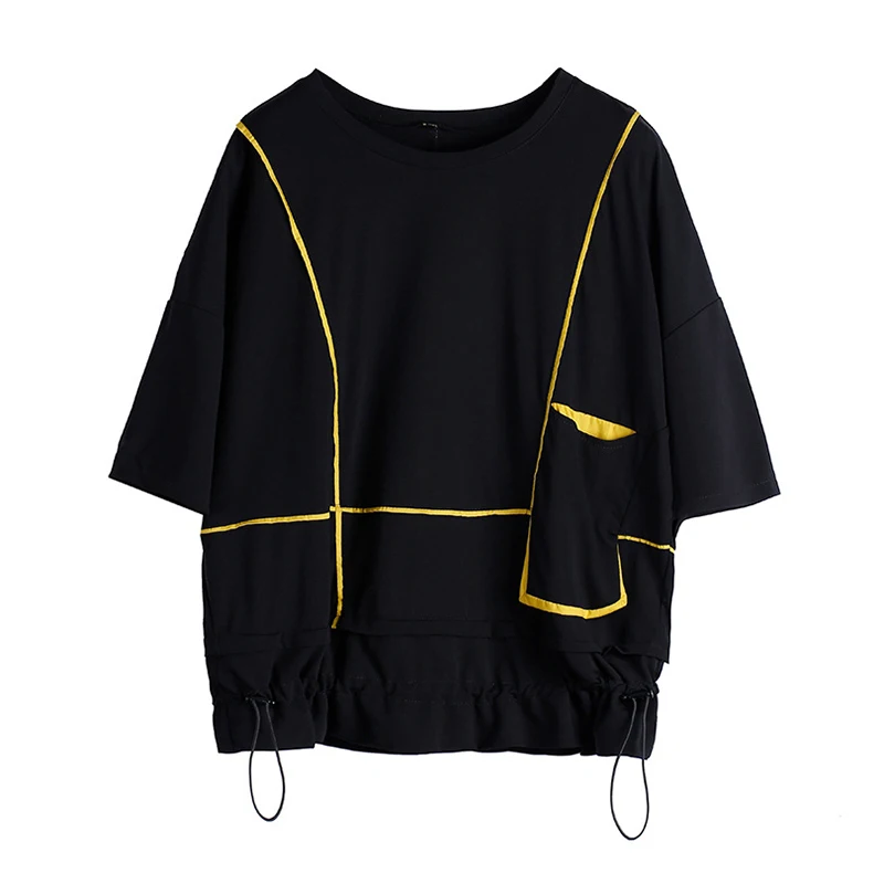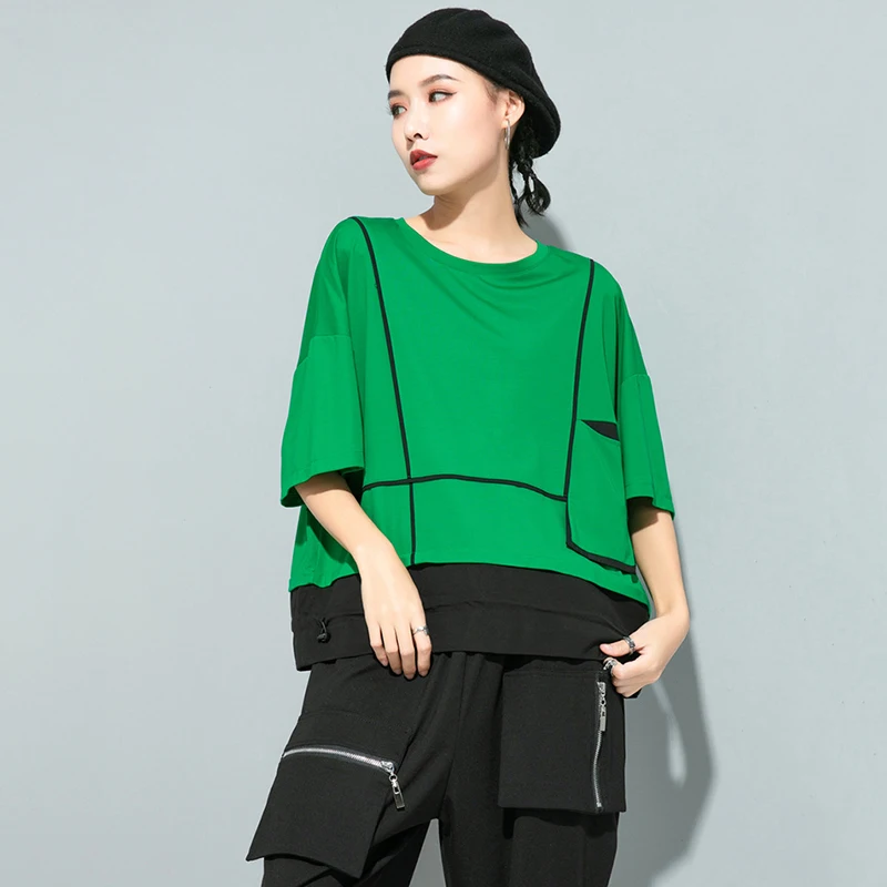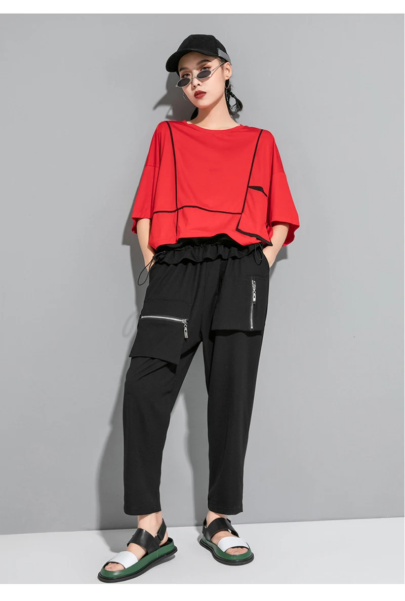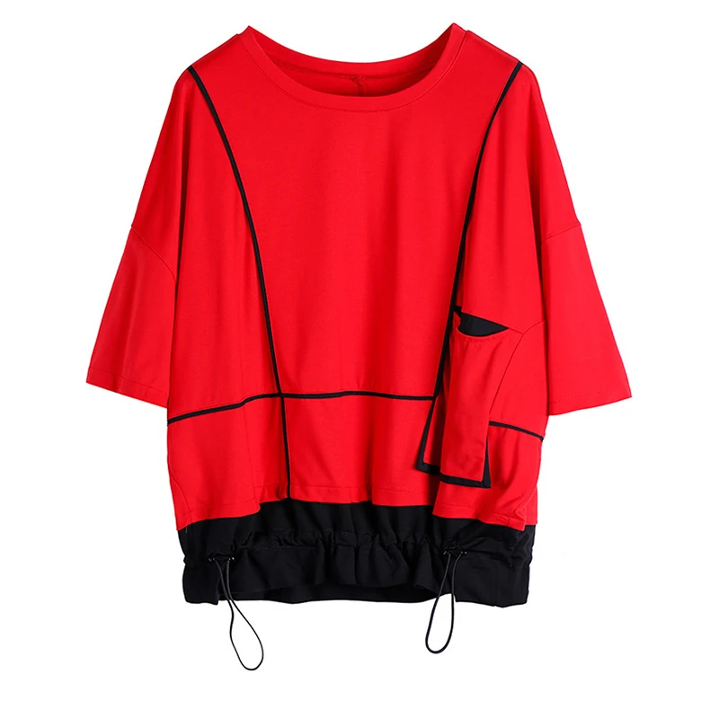 Women Red Pocket Split Joint Big Size T-shirt New Round Neck Three-quarter Sleeve Fashion Tide Spring Summer 1U622