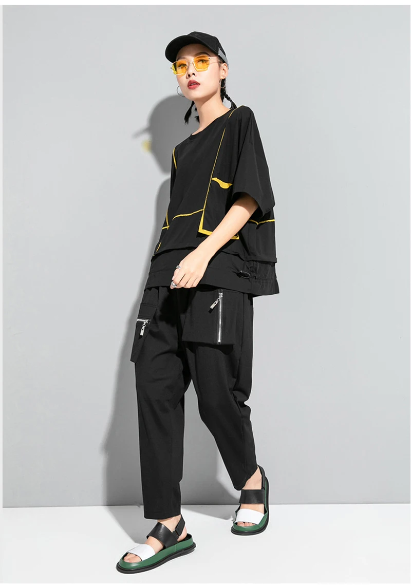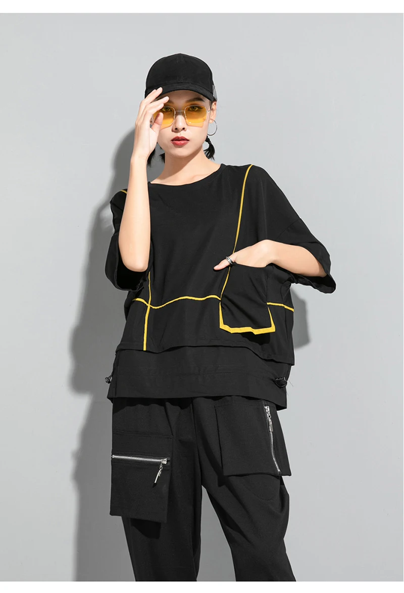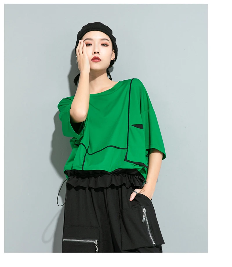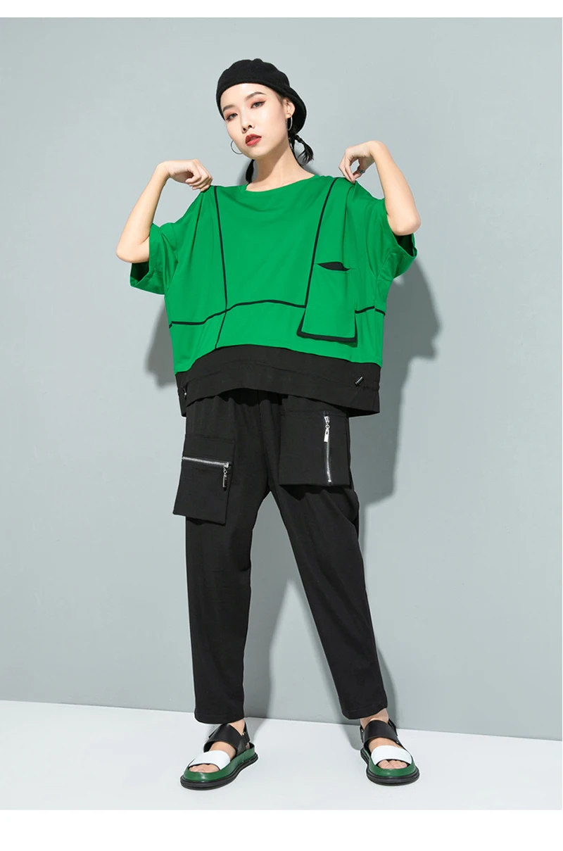 Women Red Pocket Split Joint Big Size T-shirt New Round Neck Three-quarter Sleeve Fashion Tide Spring Summer 1U622