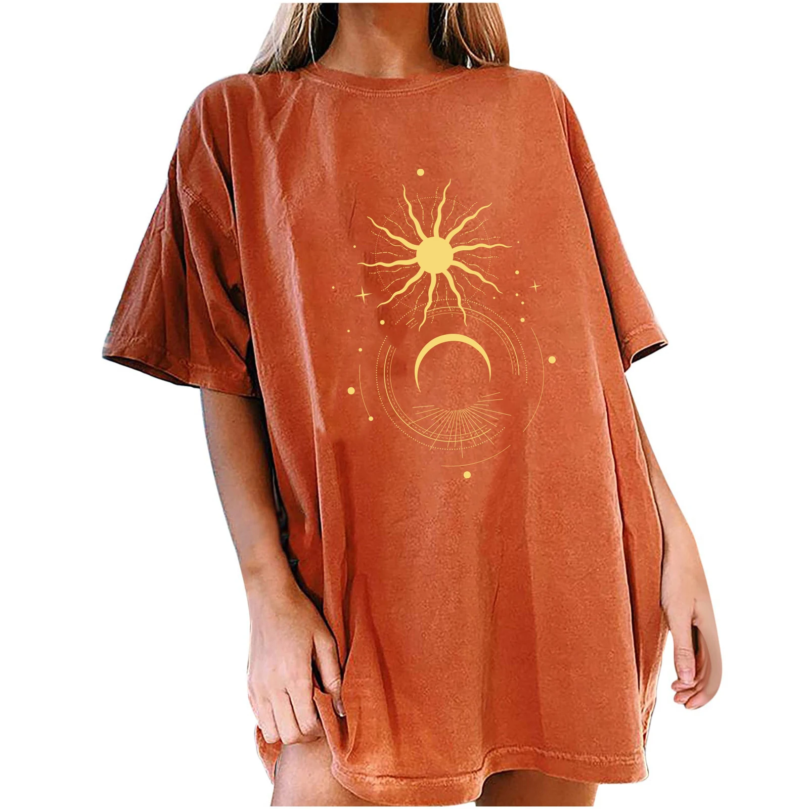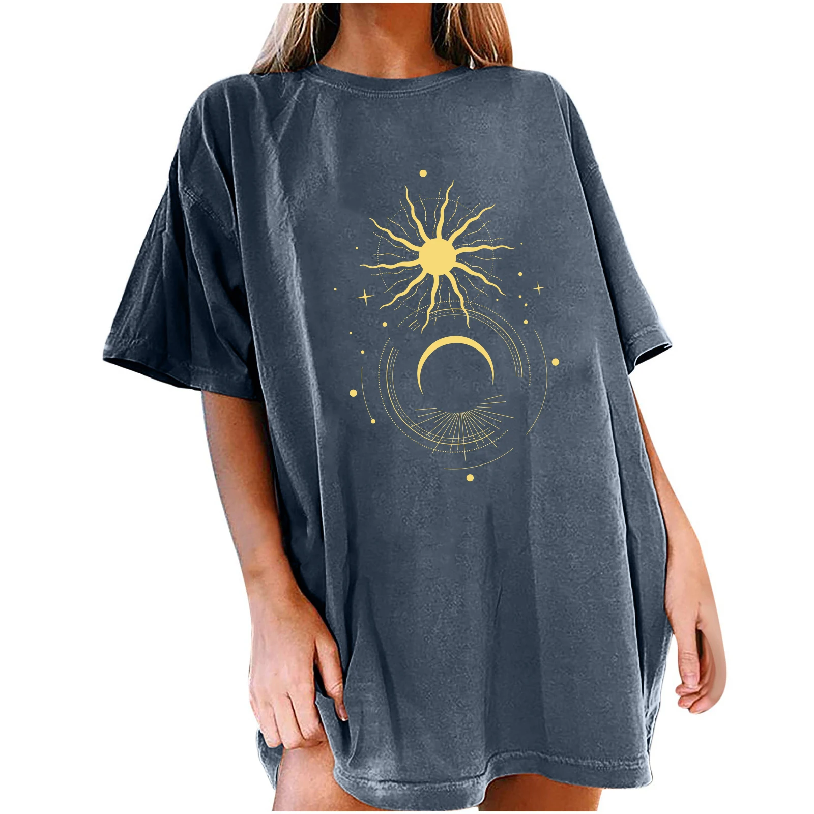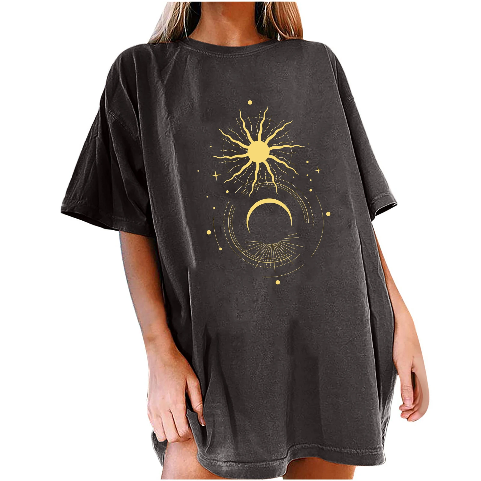 Drop Shoulder Women T Shirt Golden Moon and Stars Print Summer T Shirt Half Sleeve Femme Tee Shirt for Women Clothes