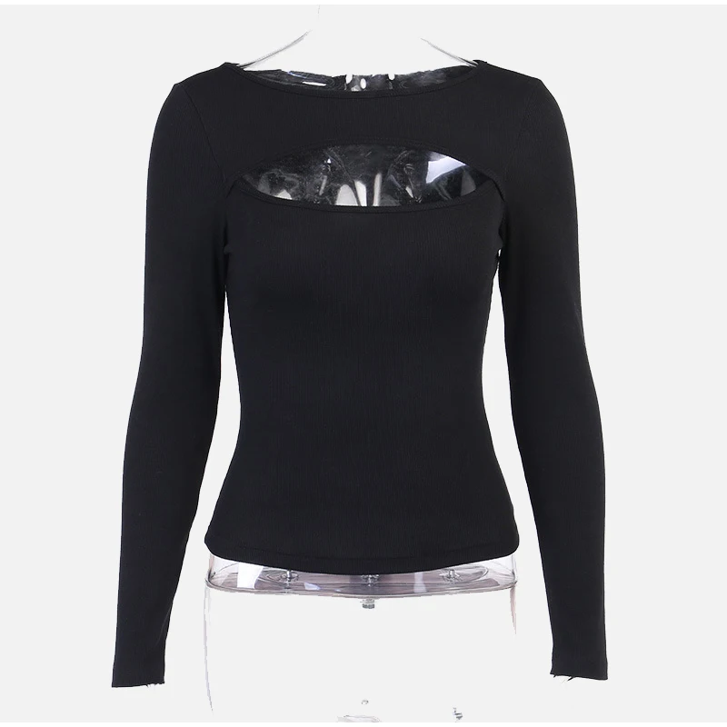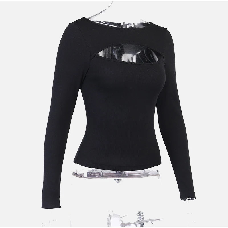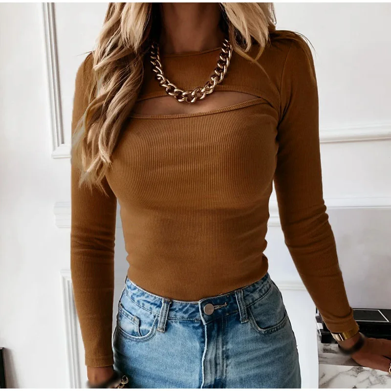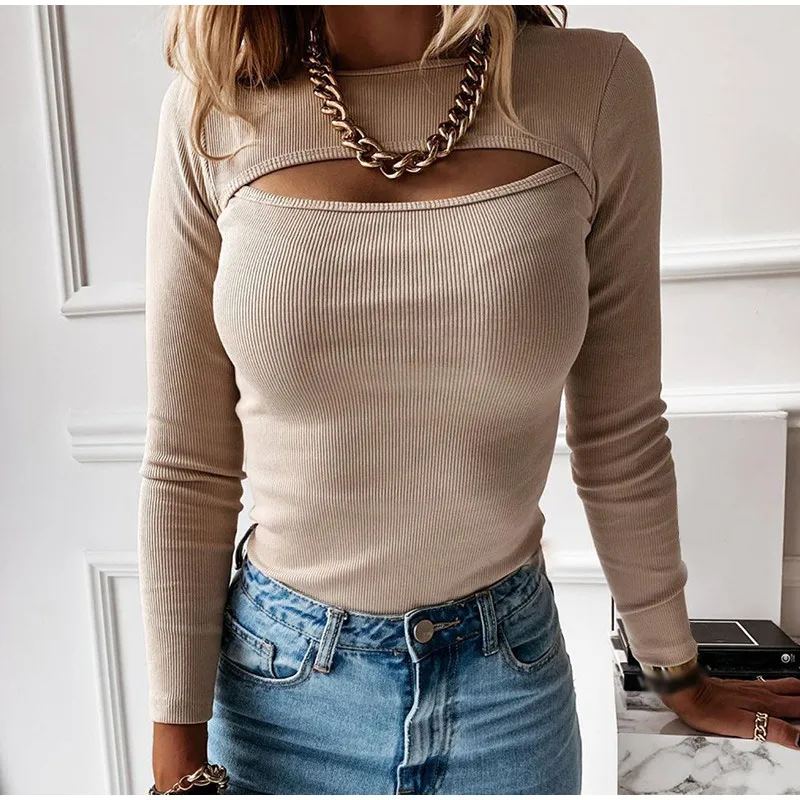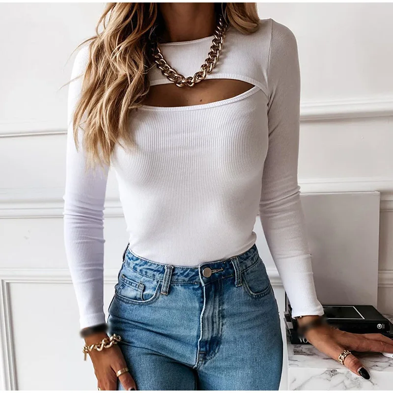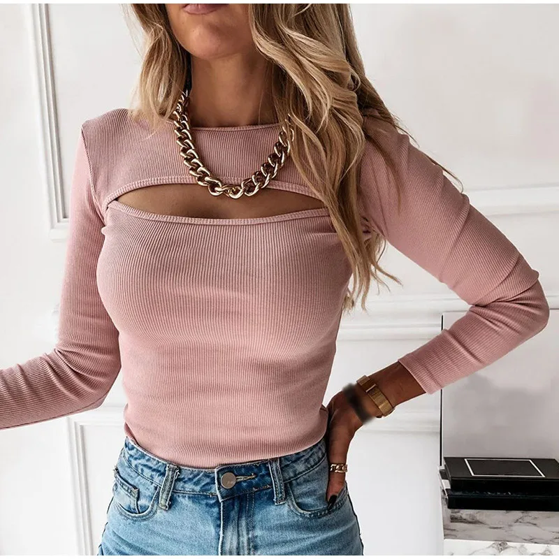 Hollow Out Knitted Ribbed Women's T-shirts Long Sleeve O-Neck Female Slim Tops Autumn 2021 Spring Solid Casual Ladies T-shirt