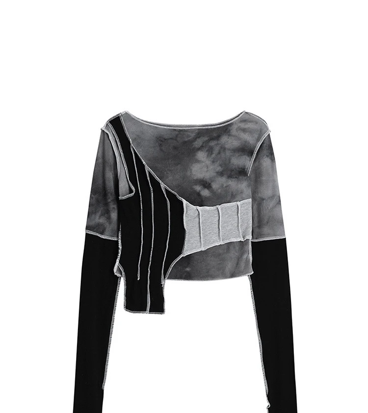 Irregular Patchwork Crop Bodycon T Shirt Women Long Sleeve Streetwear Chic Tees O Neck Ins Ulzzang Casual Loose Tide Tops