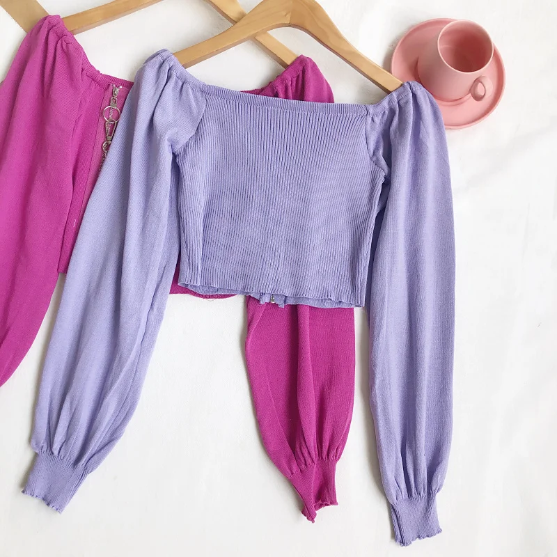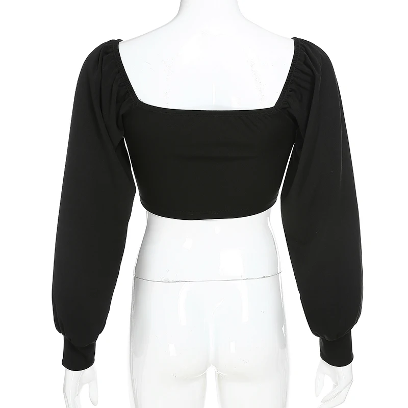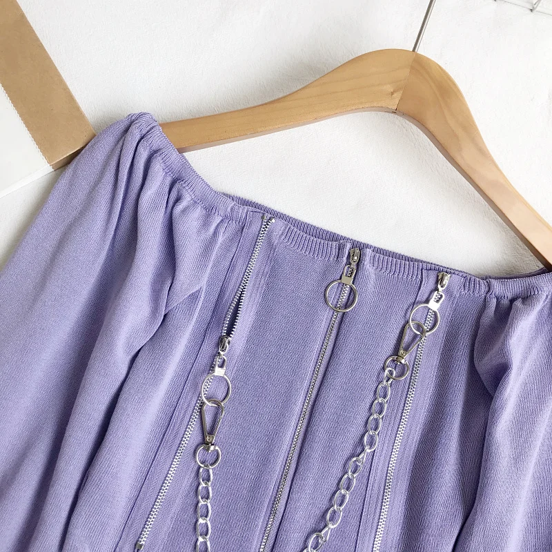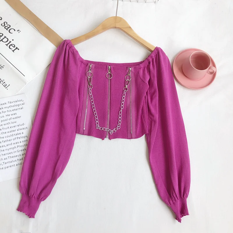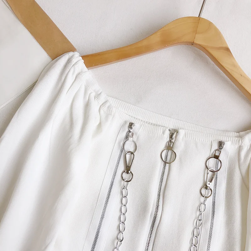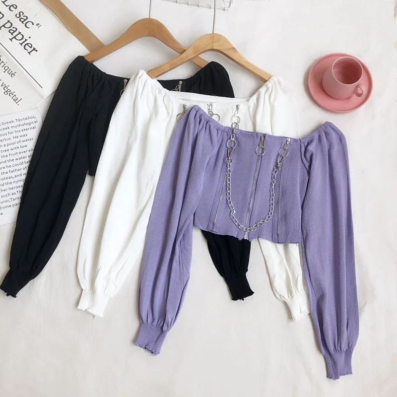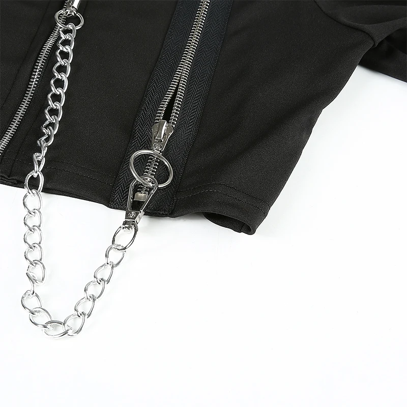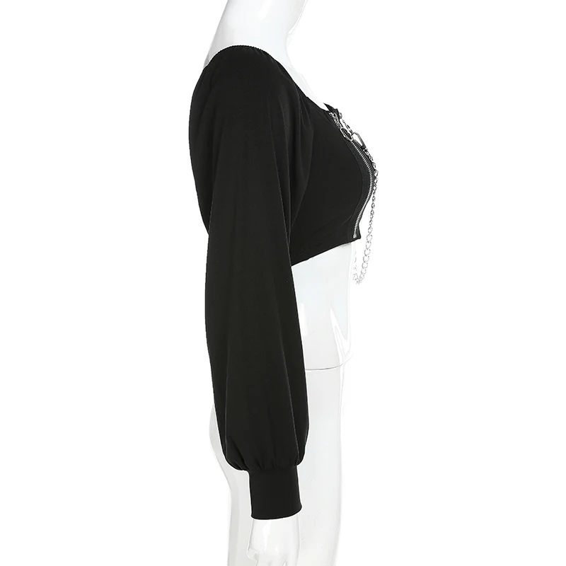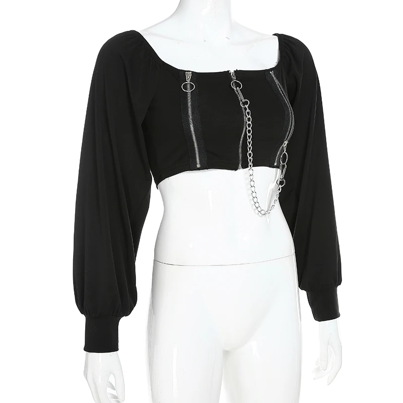 ITOOLIN Goth T-Shirt Zip Up Crop Top Women Off Shoulder Tees Chains Long Sleeve Y2k T-shirts Gothic Dark Black Vintage Clothes