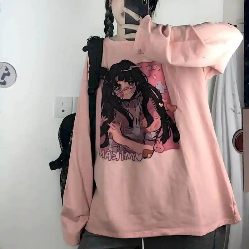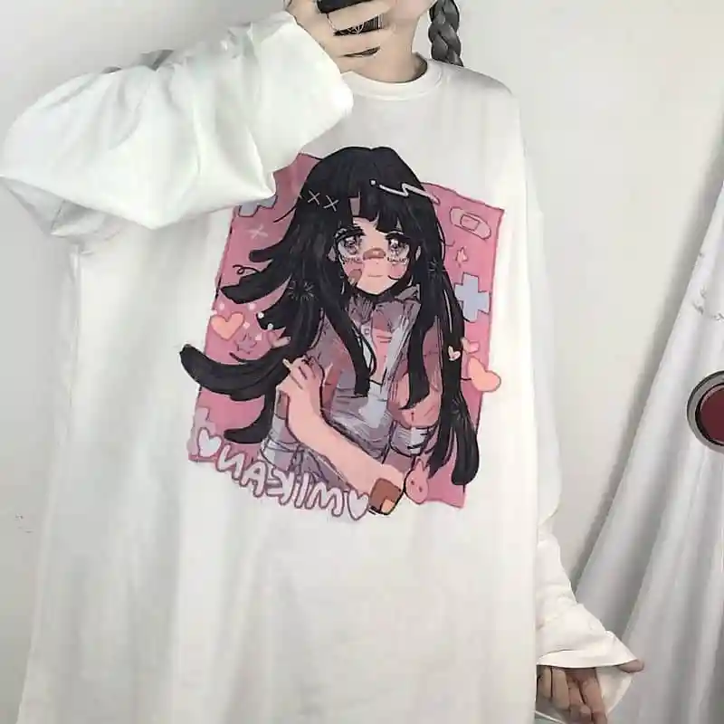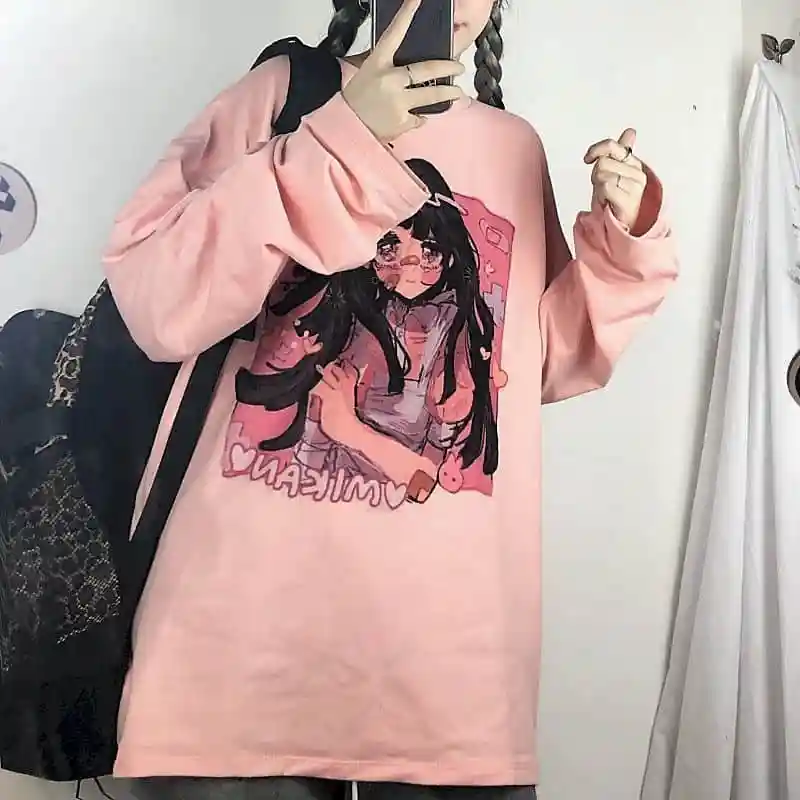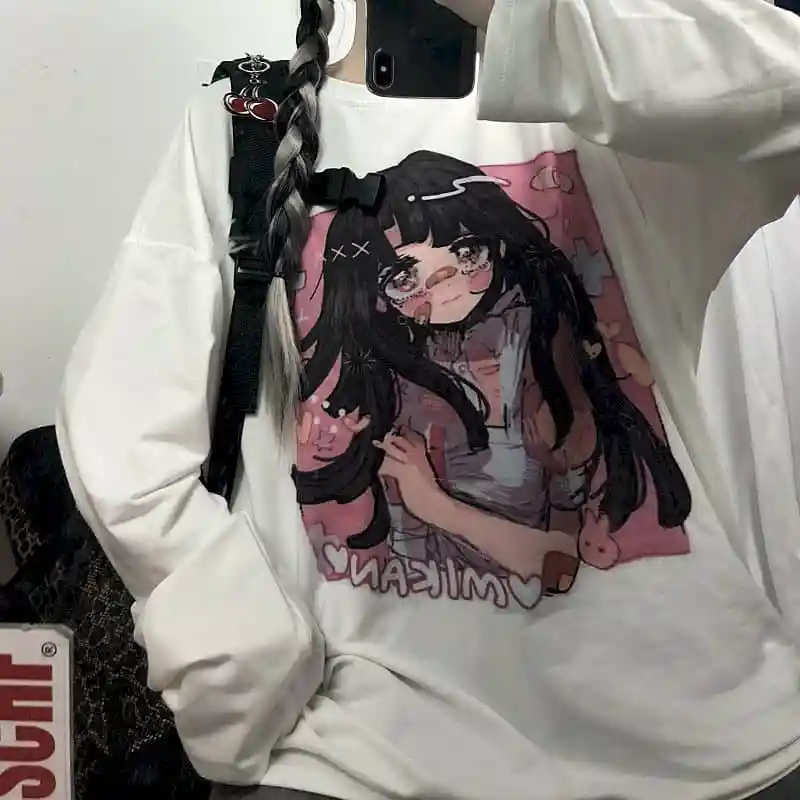 Sweet tshirt women t shirt ins Harajuku bf retro tops girl anime printing loose long-sleeved t-shirt female student top