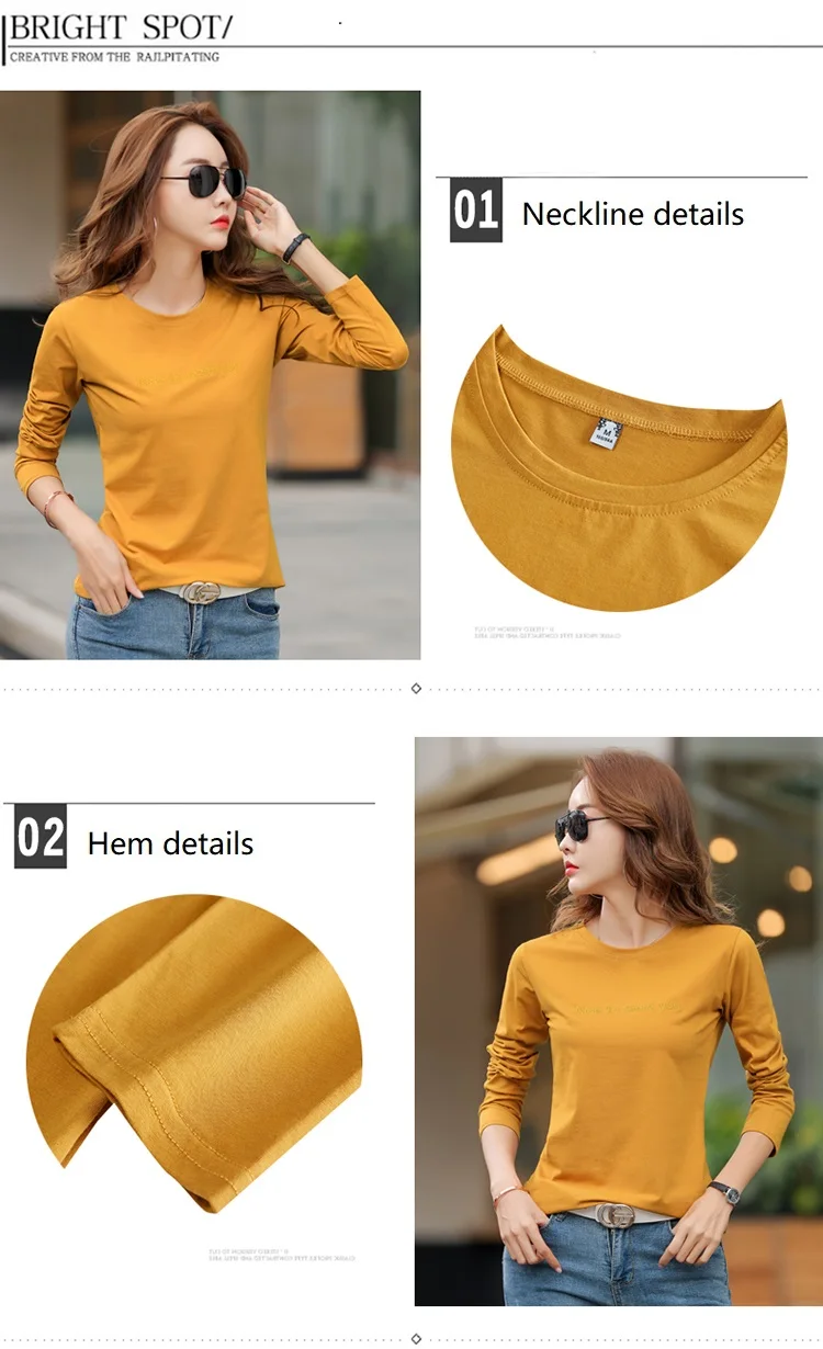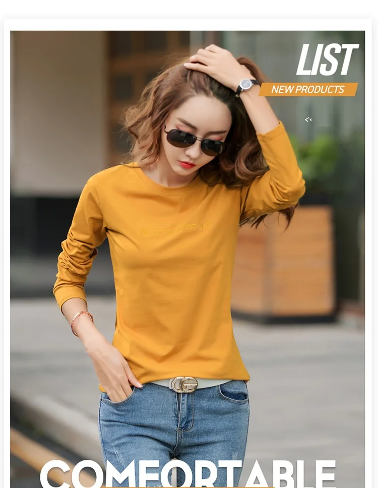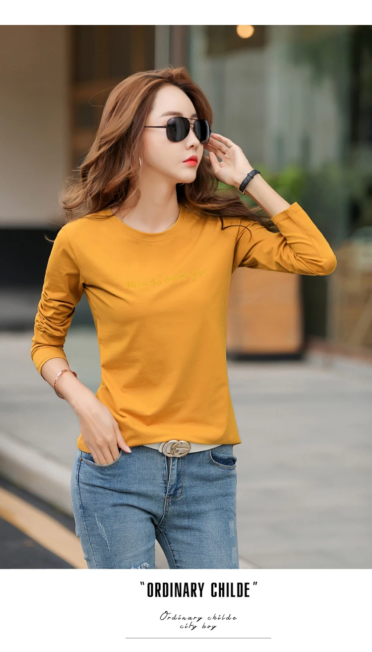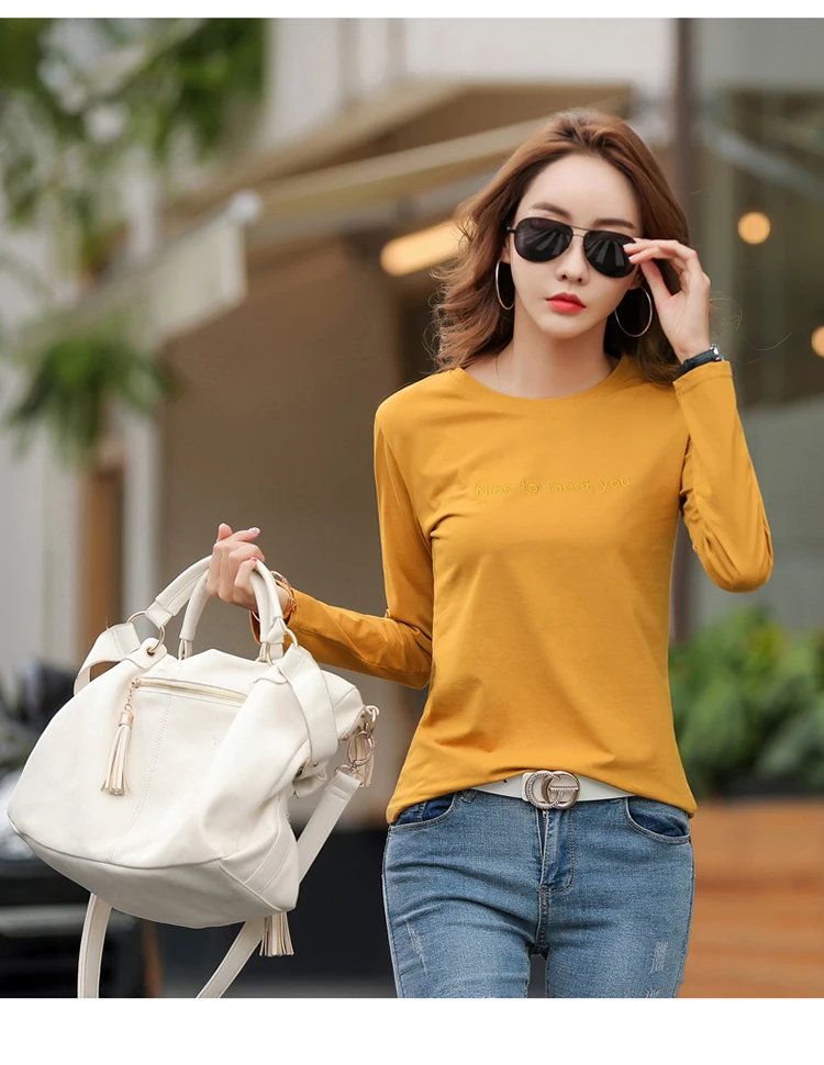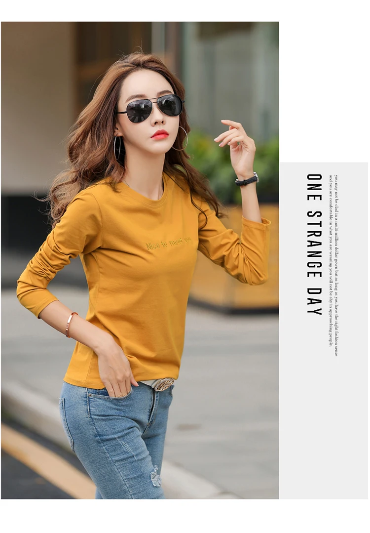 Letter Embroidery 2021 Autumn Cotton T-shirt Spring Women Long Sleeve Casual Red T shirts Fashion O-Neck Blue Yellow Simple Tops