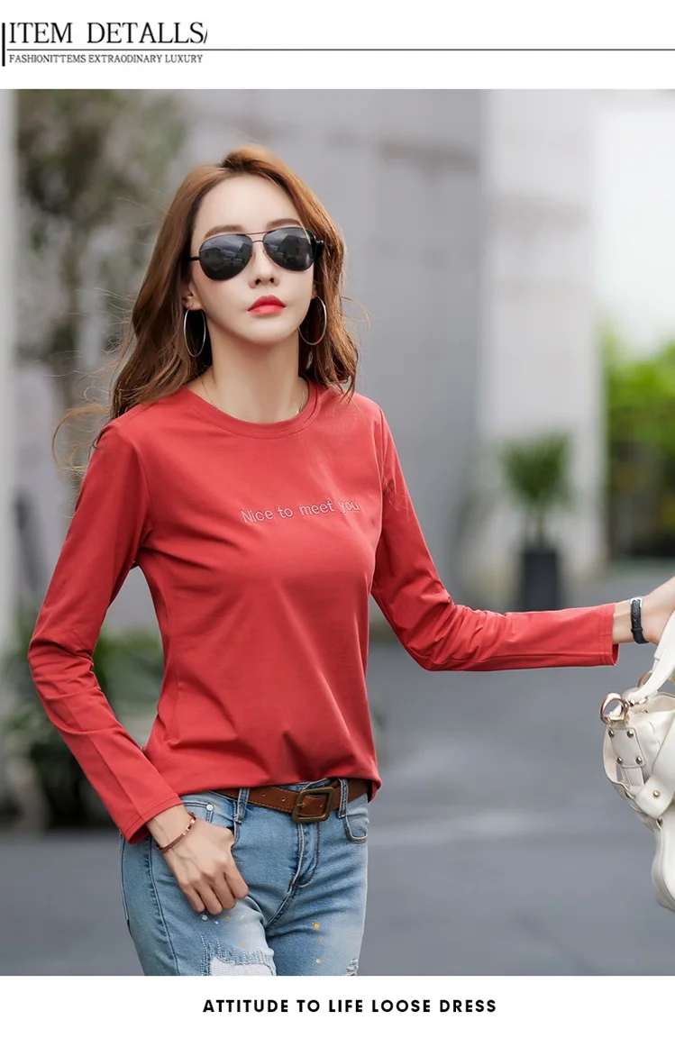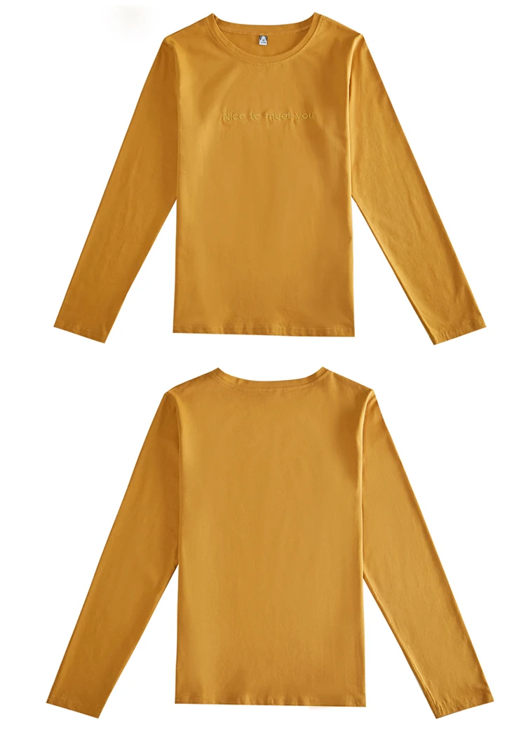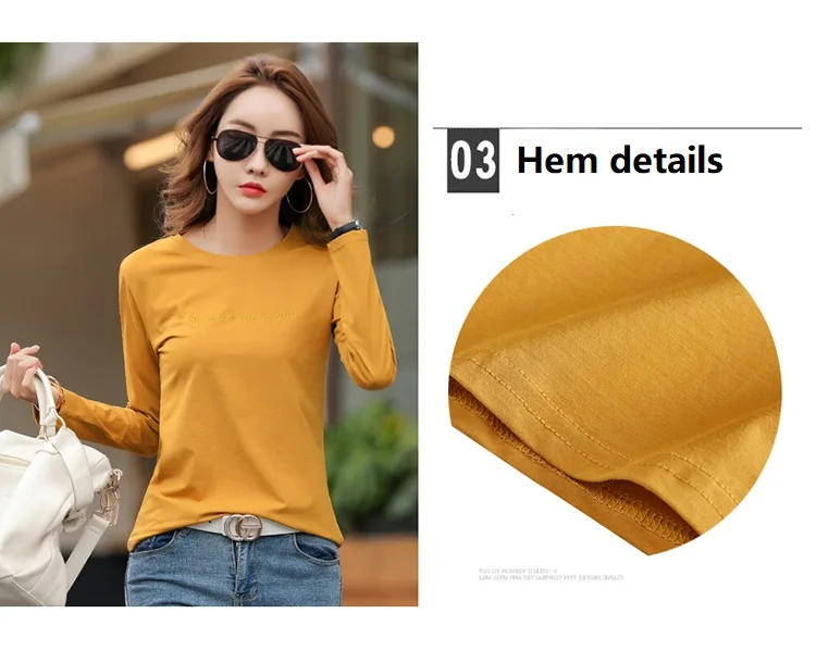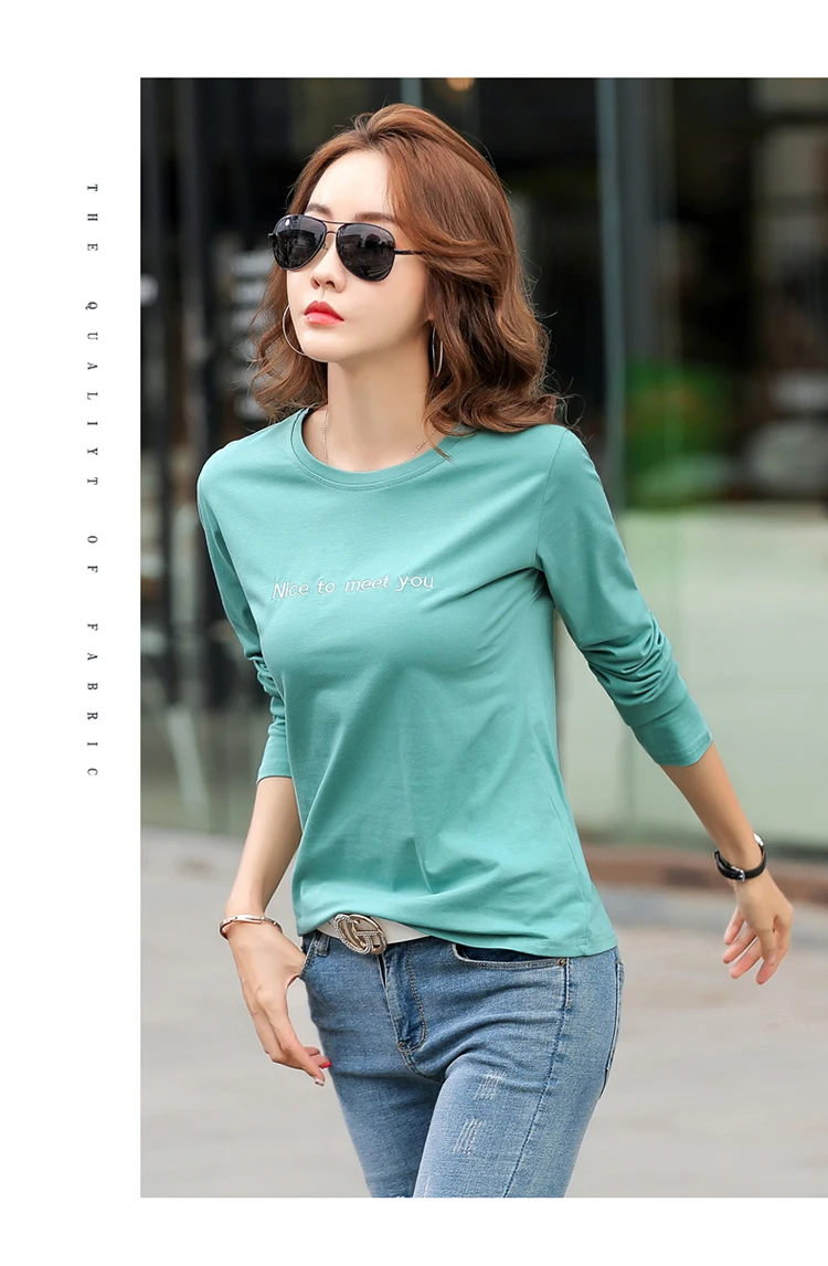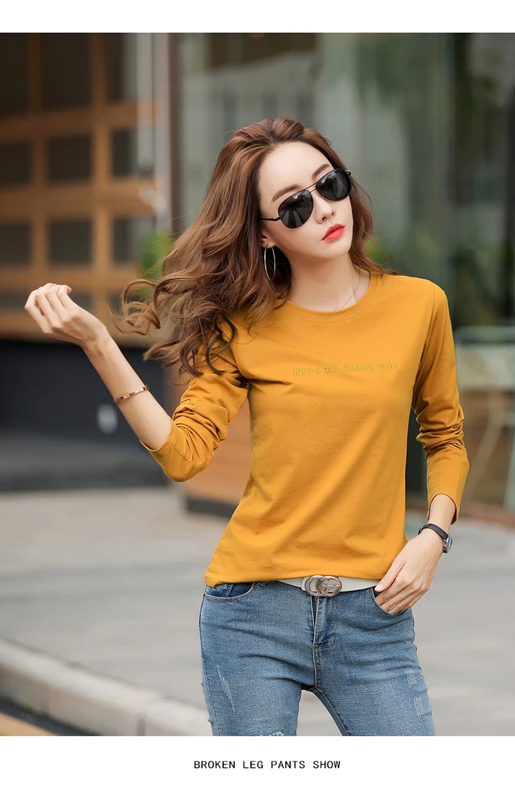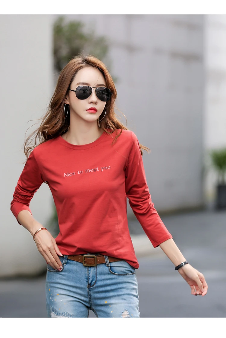 Letter Embroidery 2021 Autumn Cotton T-shirt Spring Women Long Sleeve Casual Red T shirts Fashion O-Neck Blue Yellow Simple Tops