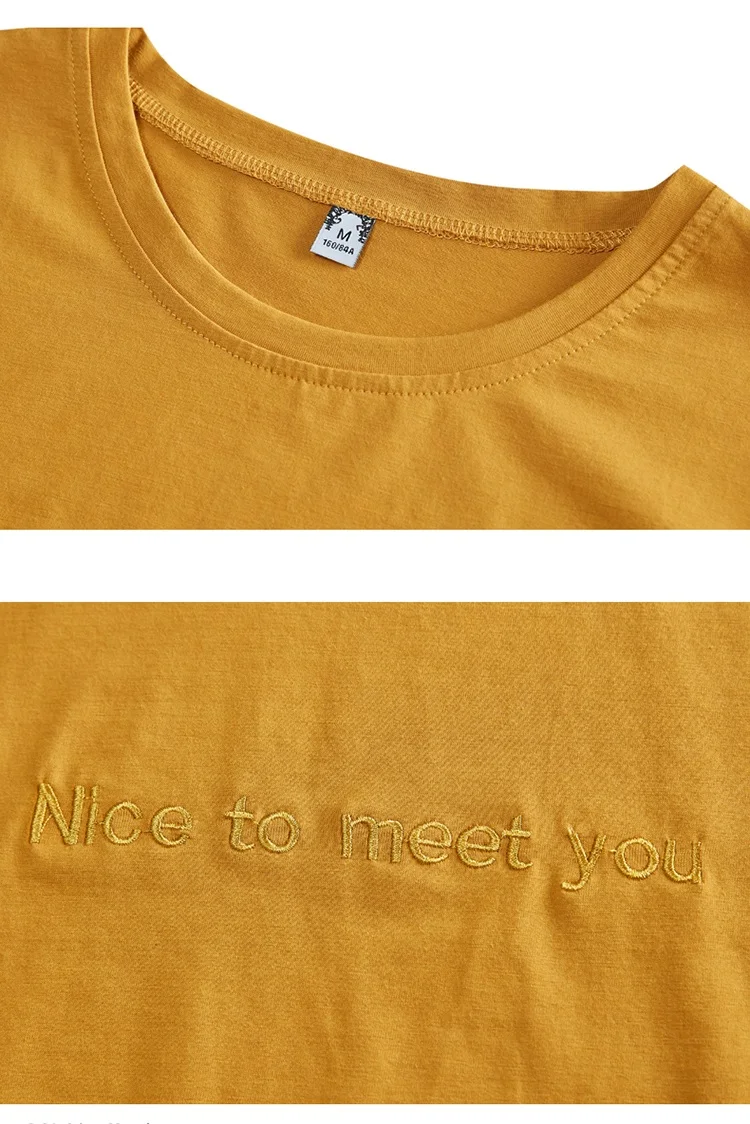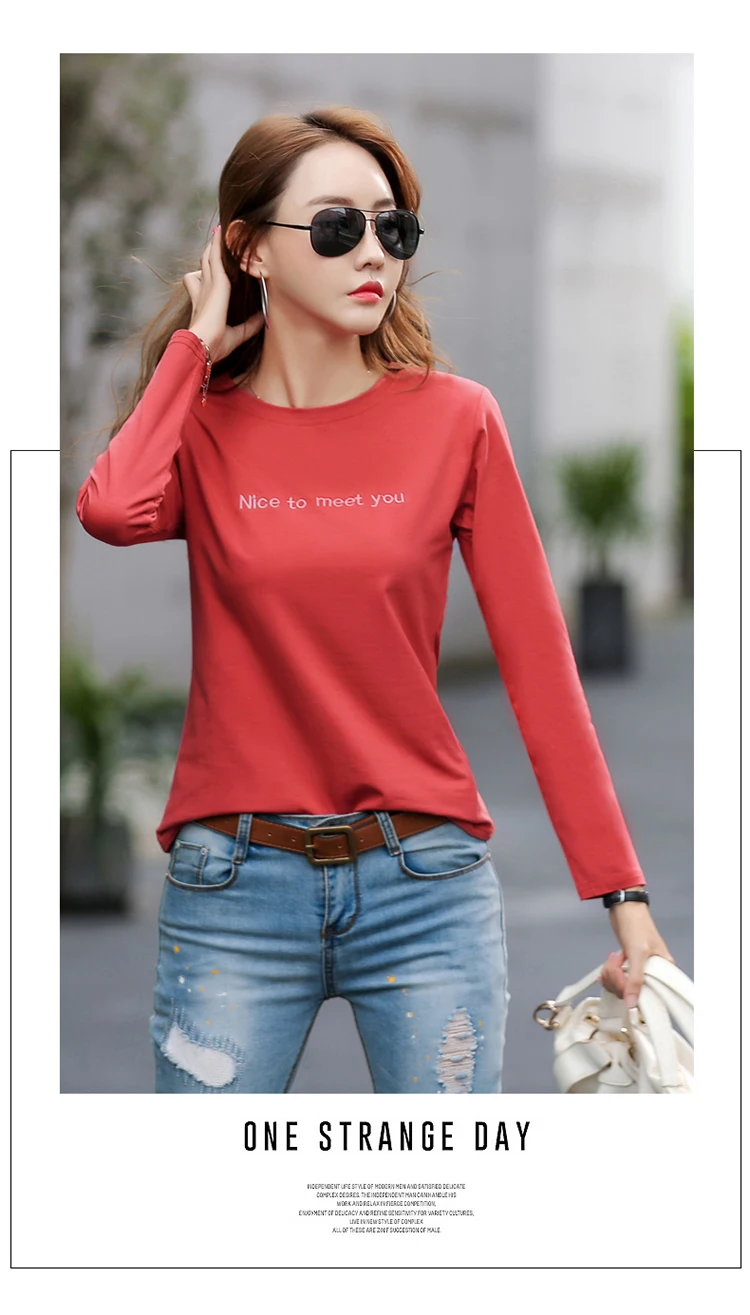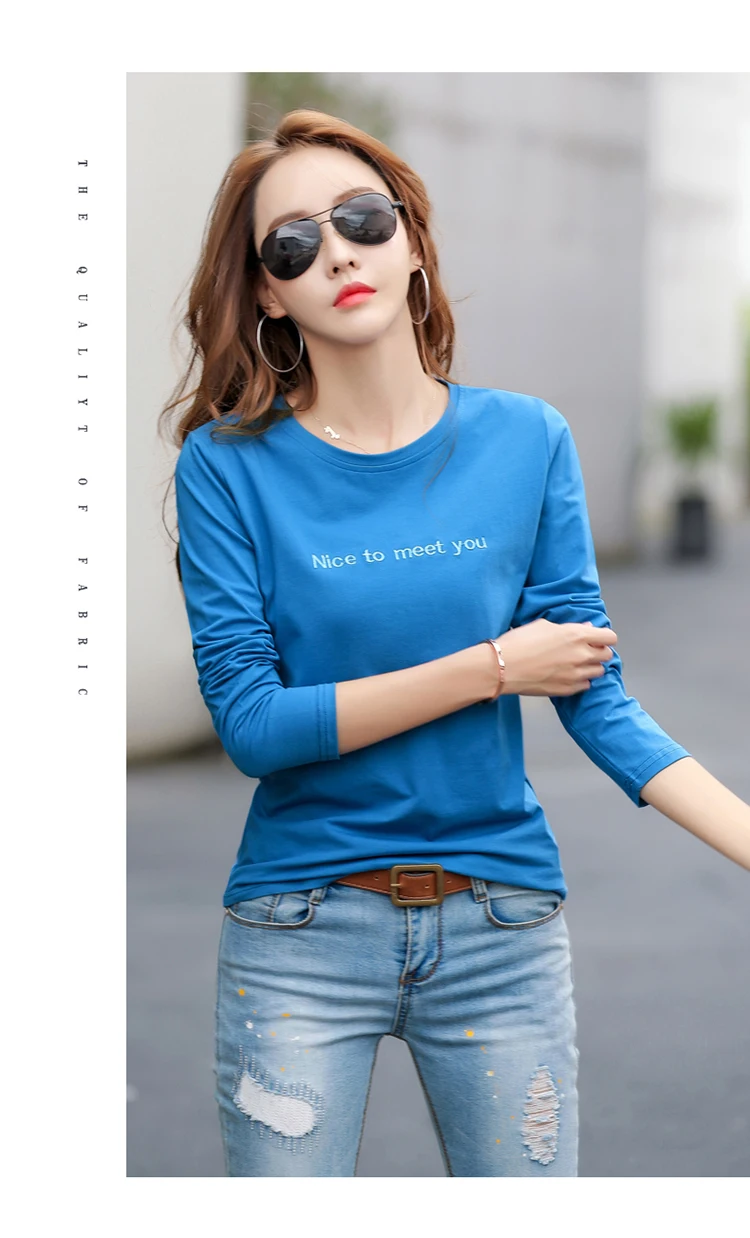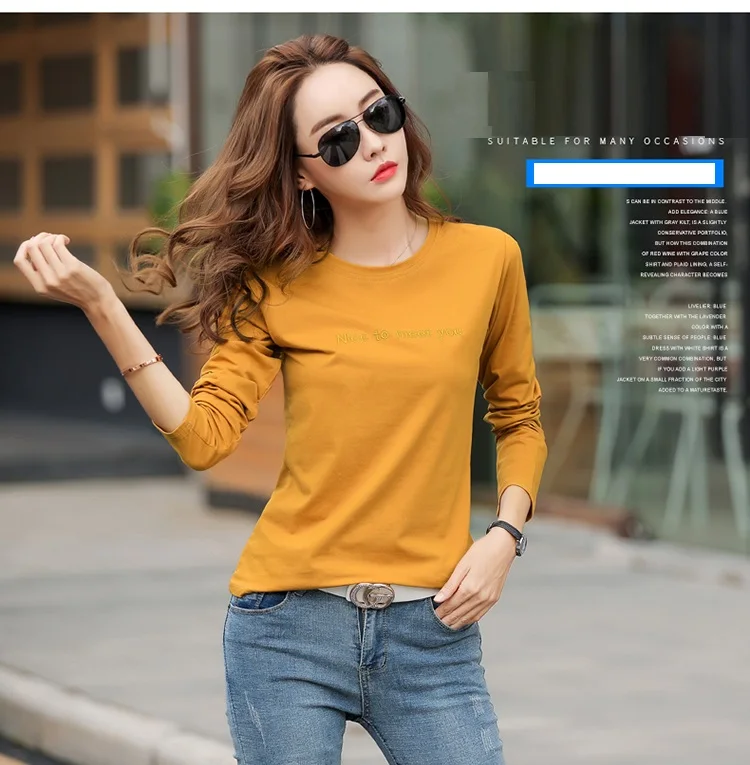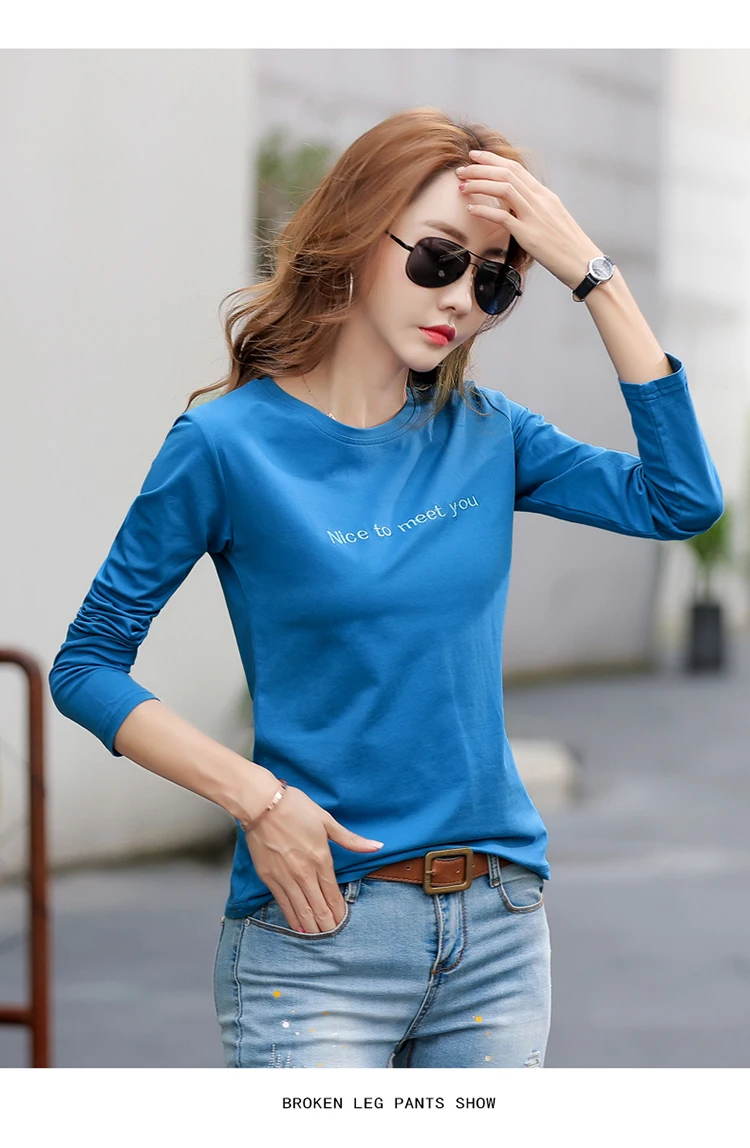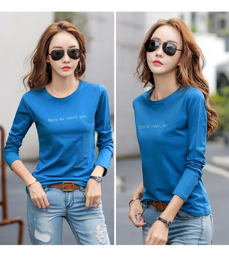 Letter Embroidery 2021 Autumn Cotton T-shirt Spring Women Long Sleeve Casual Red T shirts Fashion O-Neck Blue Yellow Simple Tops
