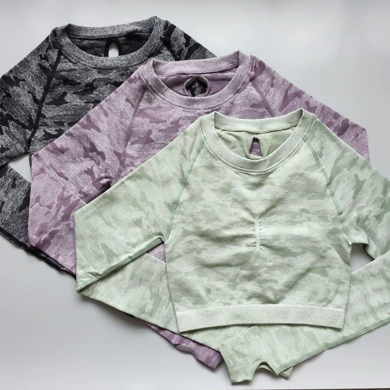 Women Camo Seamless Cropped Top Seamless Long Sleeve Top Sports Wear for Women Gym Yoga Shirt Crop Top Workout