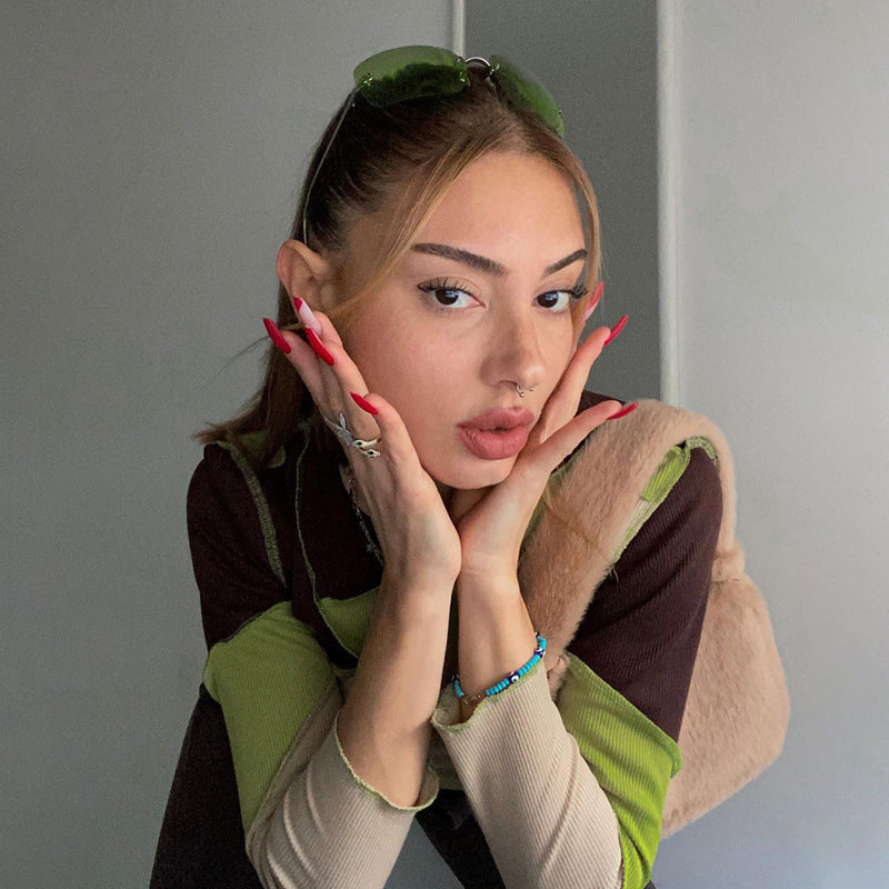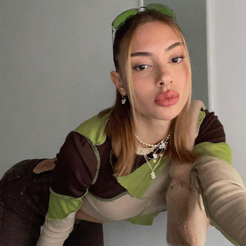 Nibber Round Neck Contrast Patchwork Long Sleeve Sexy Crop Tops Autumn Winter Women Fashion Streetwear Outifts Short T-shirt