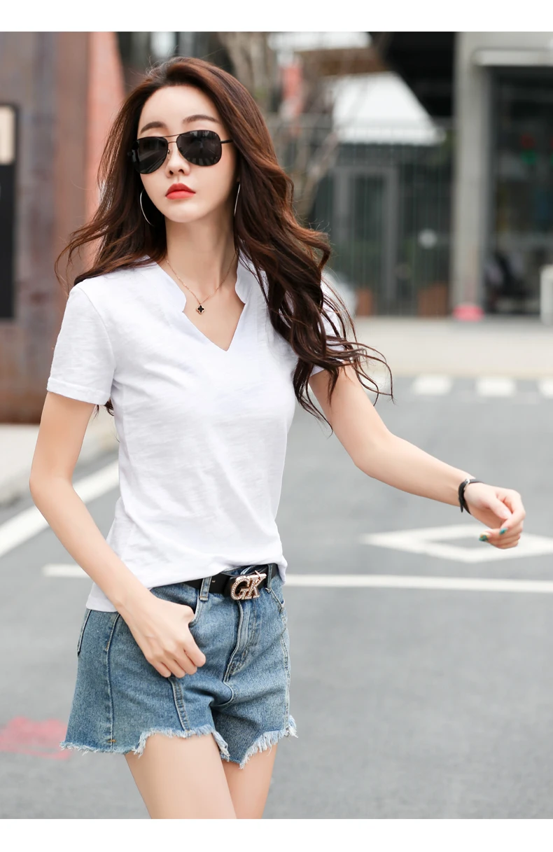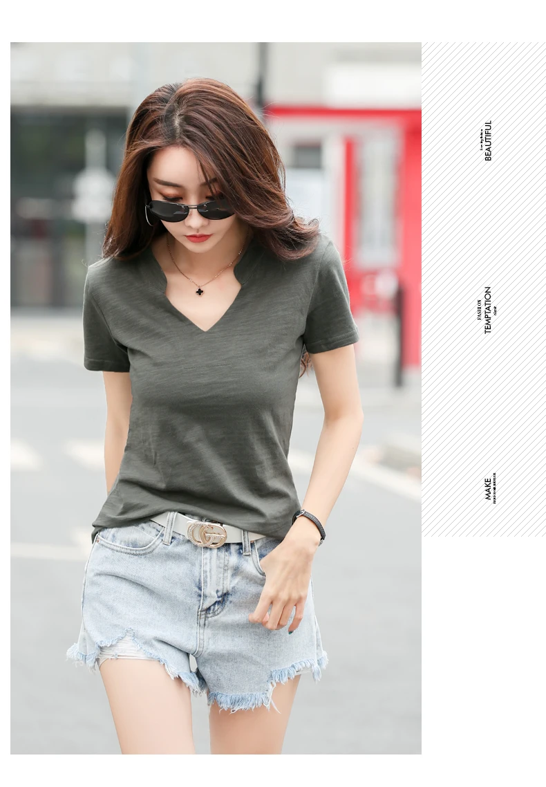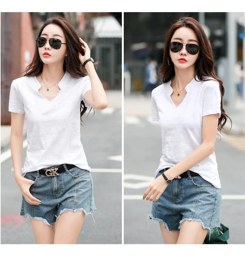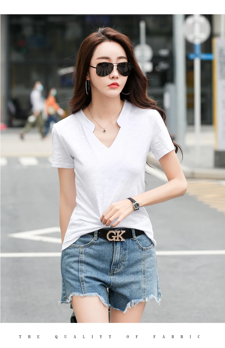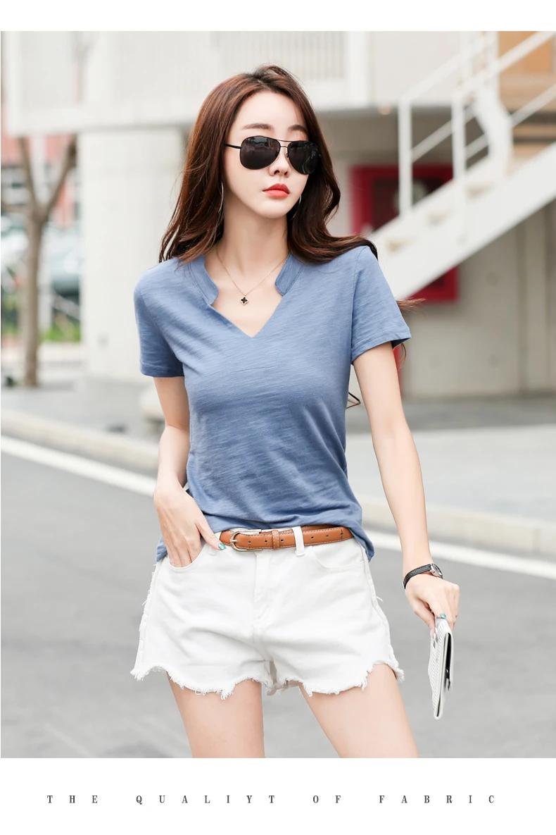 Short Sleeve Bamboo Cotton Women V-Neck T-Shirts 2021 Loose Casual Solid Color Brand T Shirt Ladies Summer Spring All-Match Tops