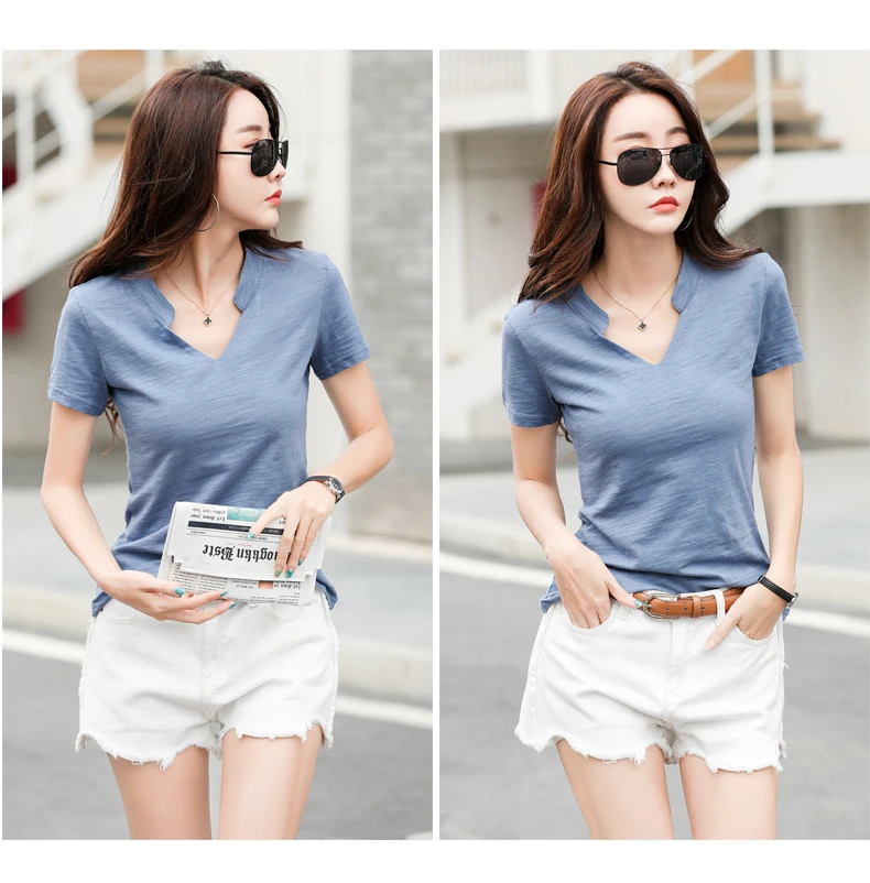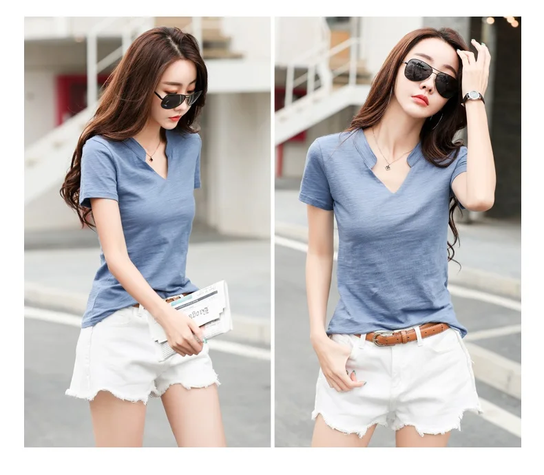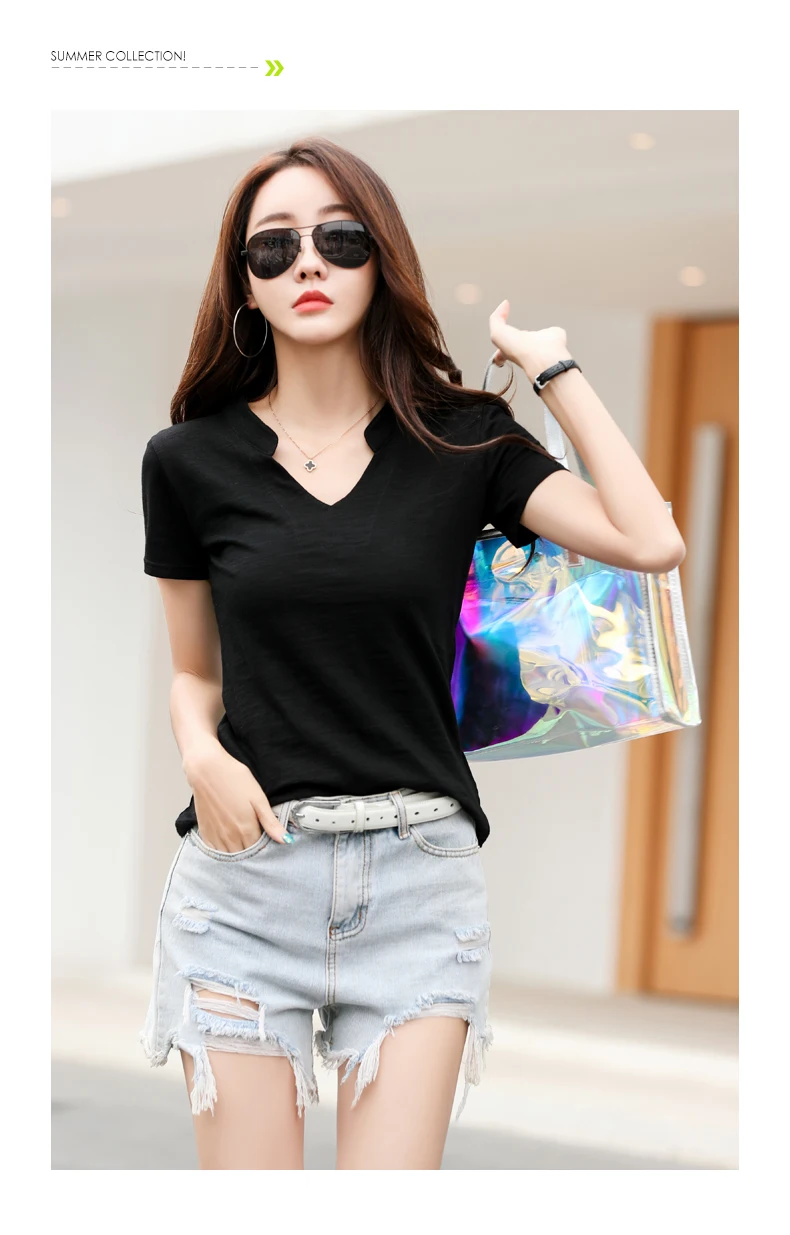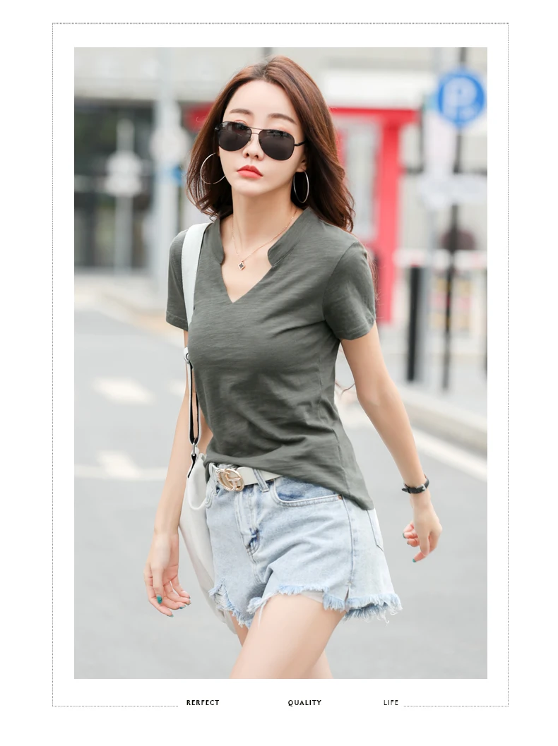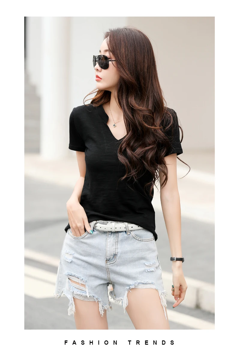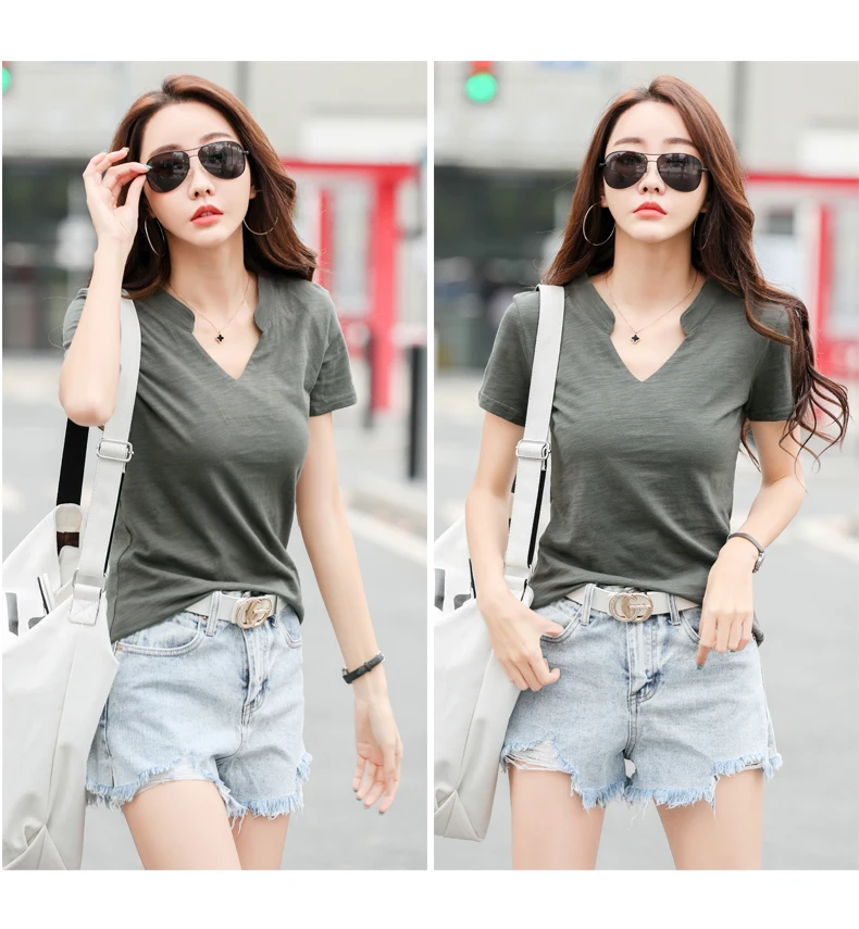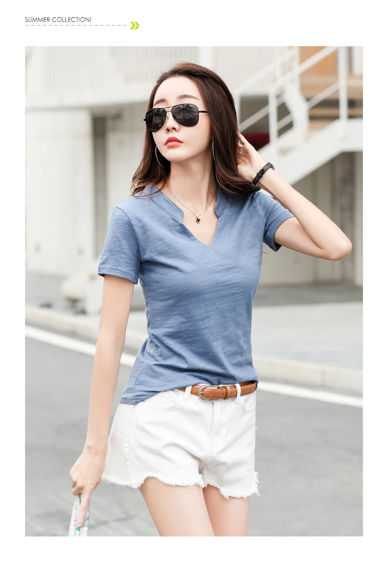 Short Sleeve Bamboo Cotton Women V-Neck T-Shirts 2021 Loose Casual Solid Color Brand T Shirt Ladies Summer Spring All-Match Tops