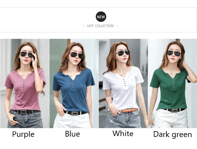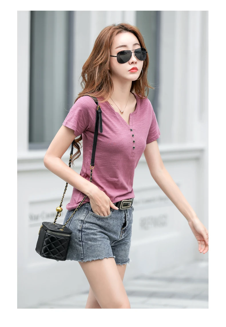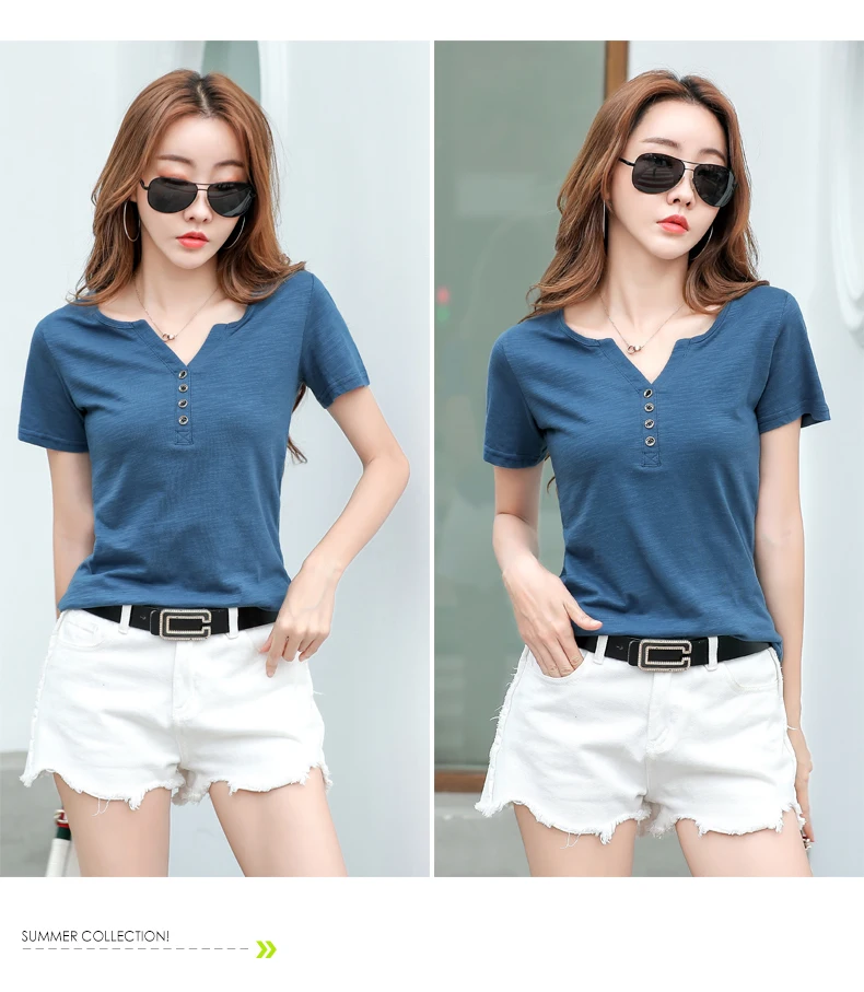 Short sleeve Summer Women Slub Cotton T-shirts Female Button Loose Casual fashion T-shirts Blue Sexy Deep V-Neck Korea Tops
