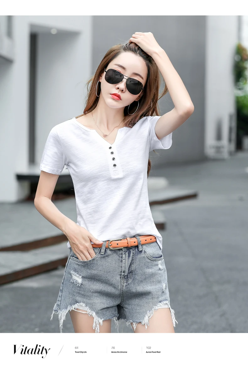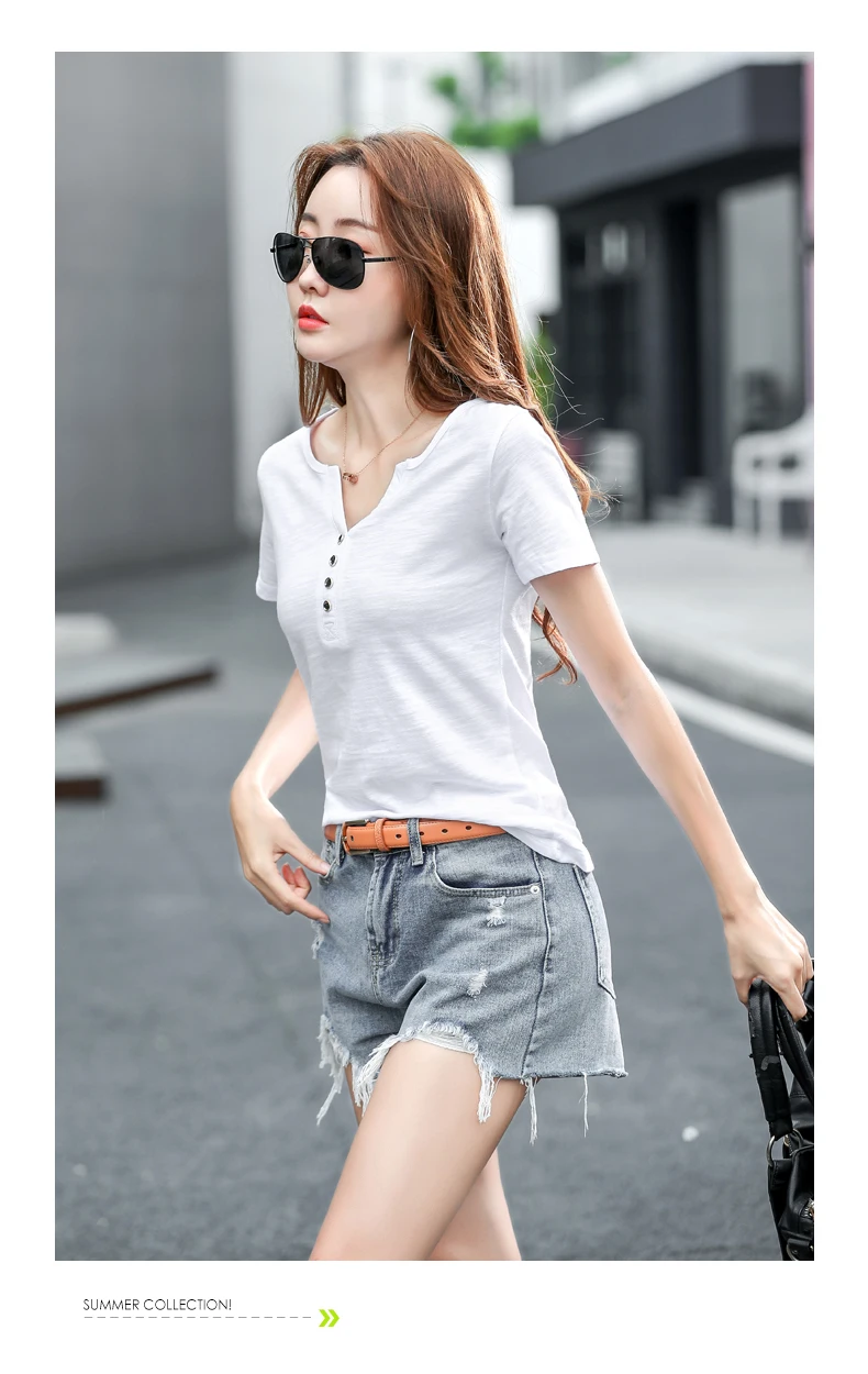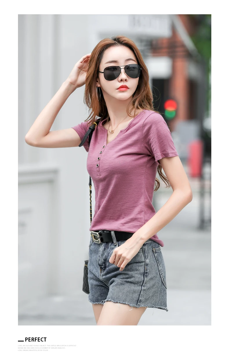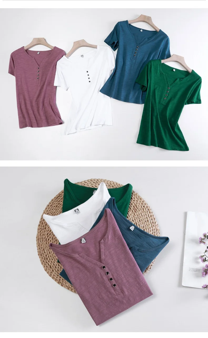 Short sleeve Summer Women Slub Cotton T-shirts Female Button Loose