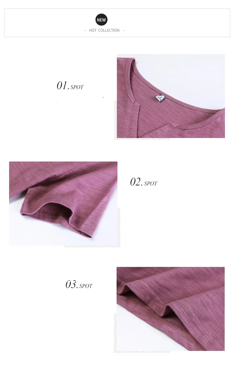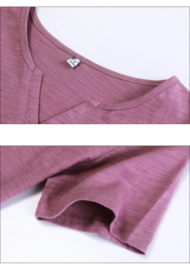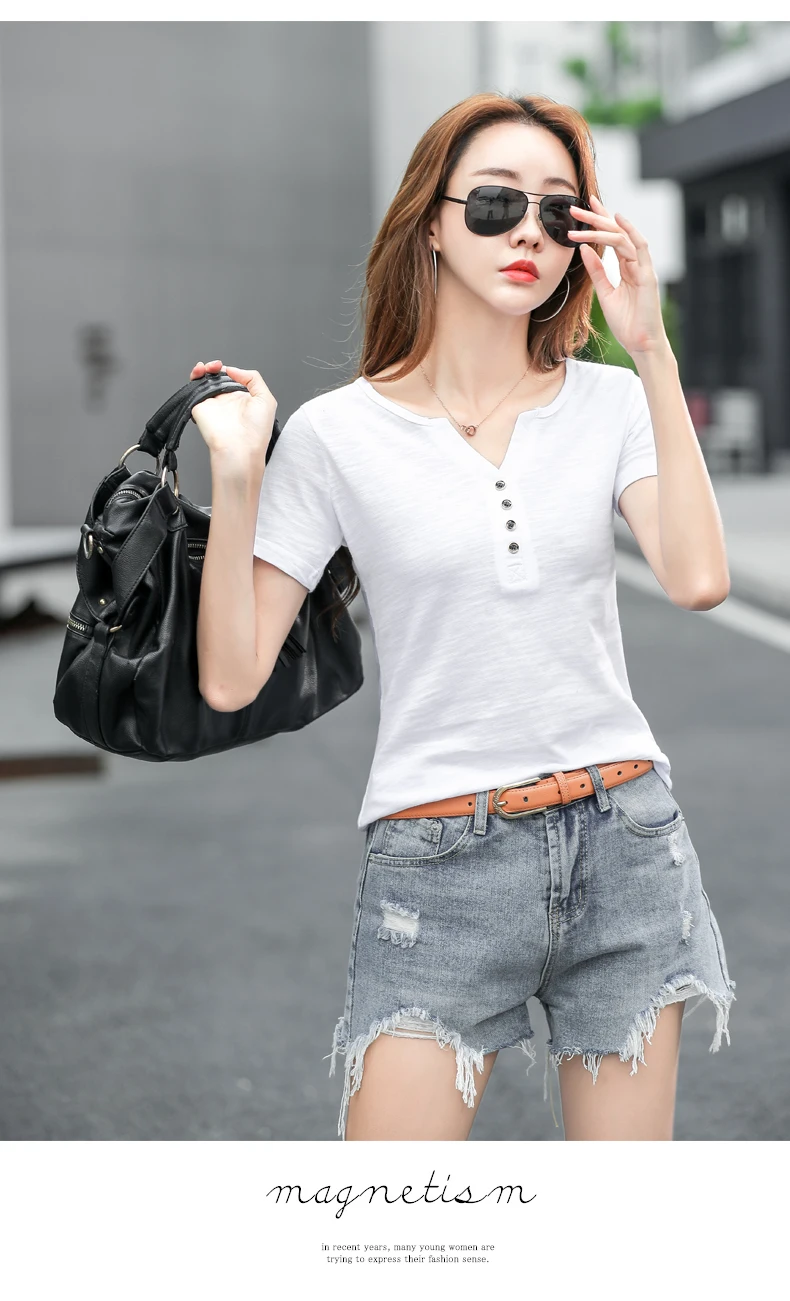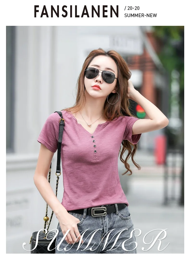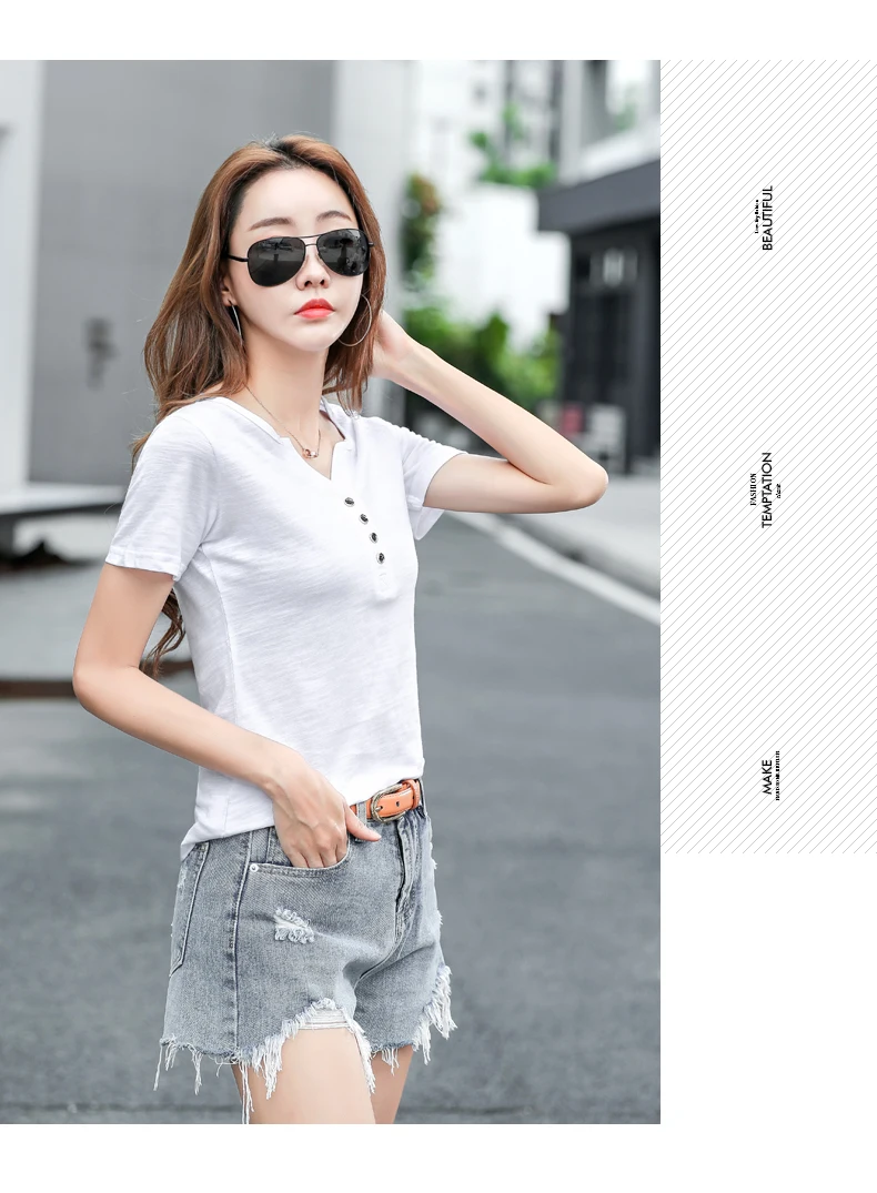 Short sleeve Summer Women Slub Cotton T-shirts Female Button Loose