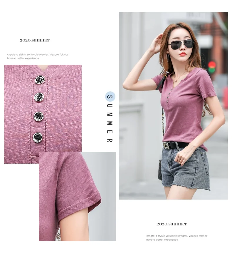 Short sleeve Summer Women 2020 Slub Cotton T-shirts Female Button Loose Casual fashion T-shirts Blue Sexy Deep V-Neck Korea Tops