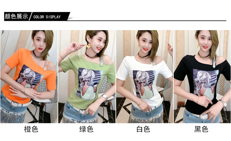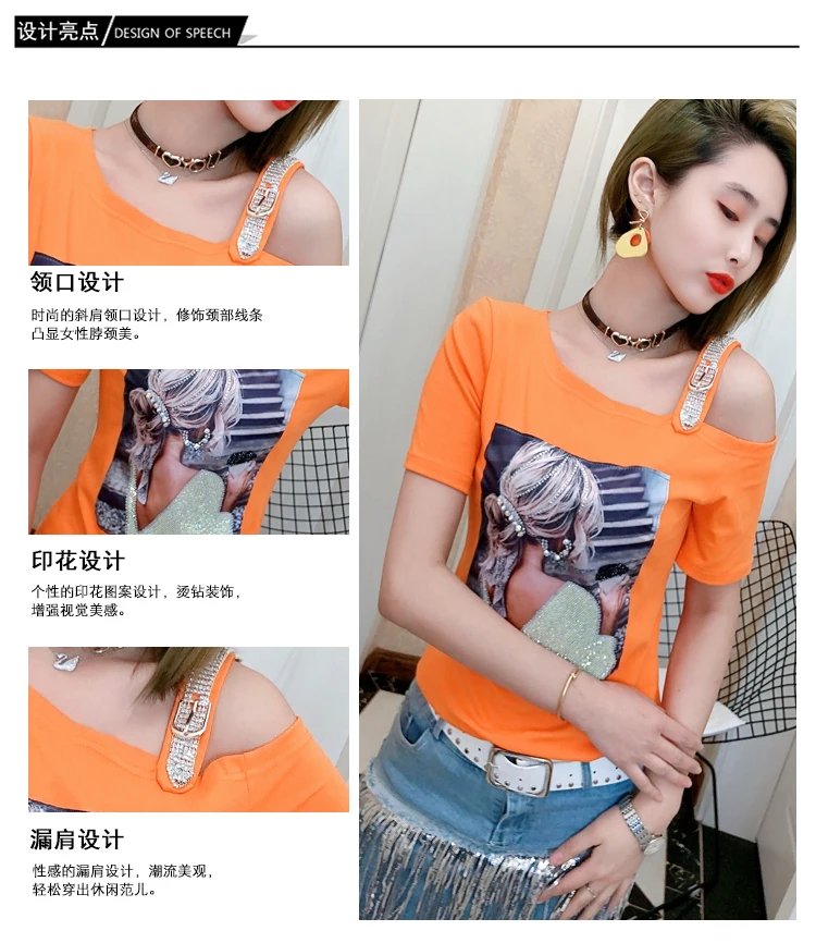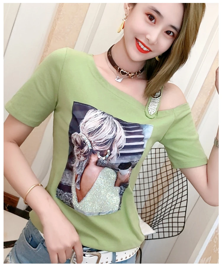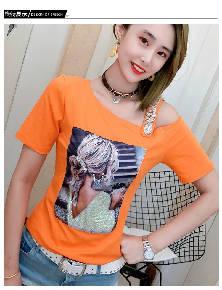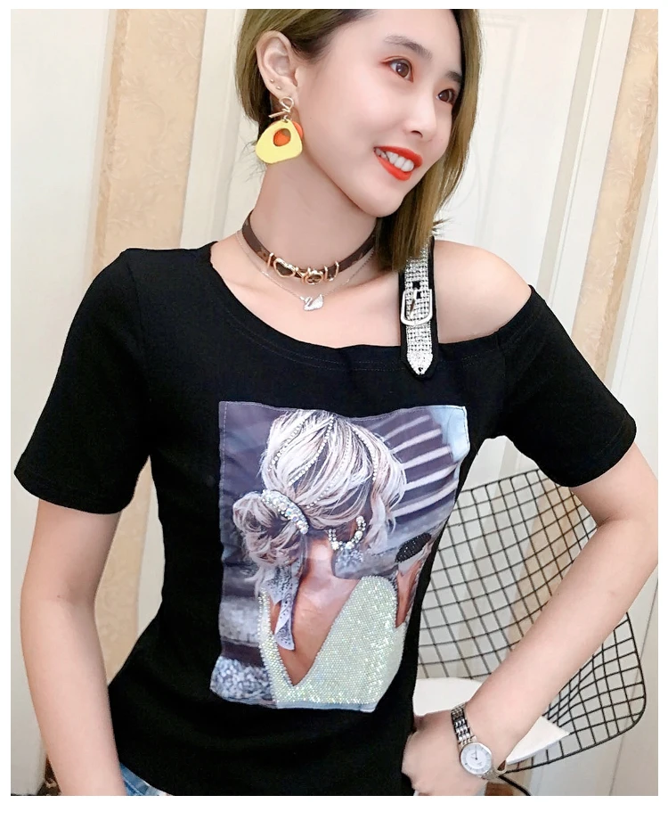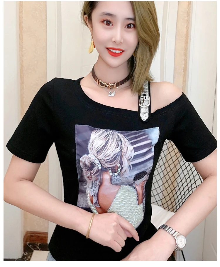 Summer Korean Clothes T-shirt Fashion Print Sexy Skew Collar Diamonds Chain Women Tops Ropa Mujer Cotton Shirt Tees 2021 T06207