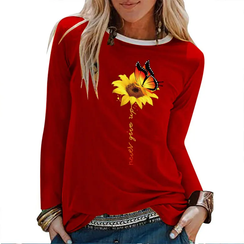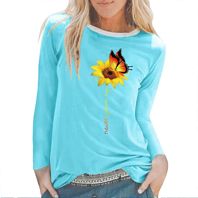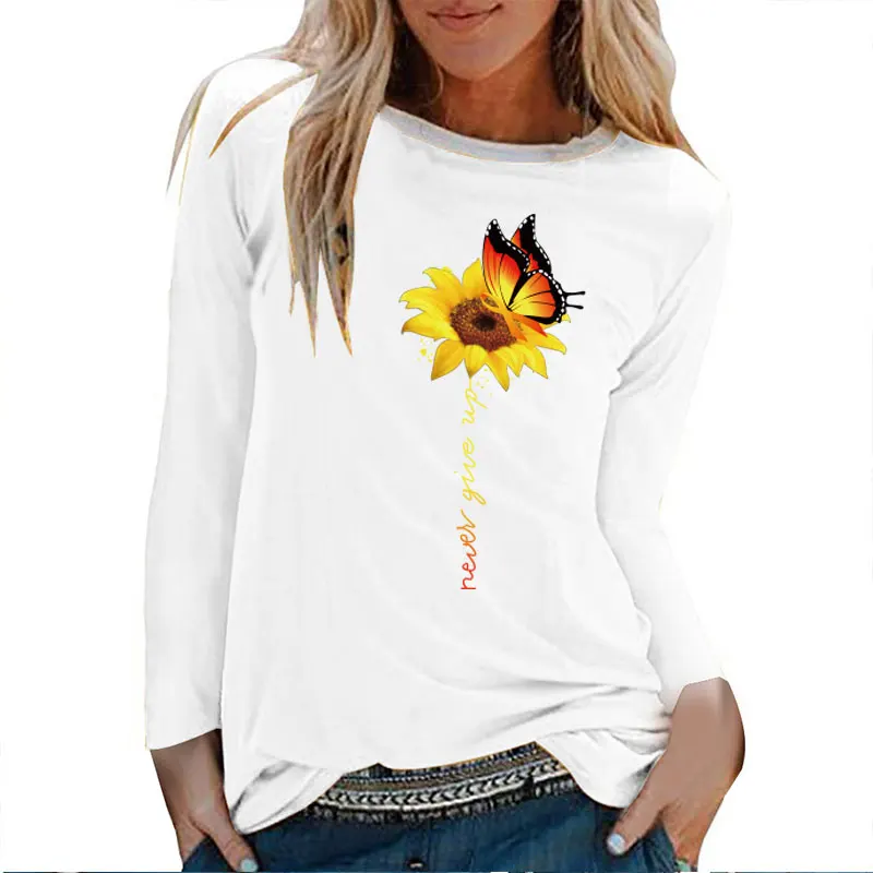 Sunflower Butterfly Never Give Up Printed Long Sleeve T-shirts Women Autumn Winter Woman Tshirt Cotton Aesthetic Clothes Female