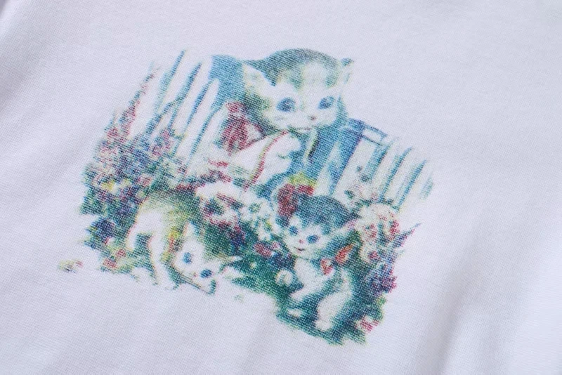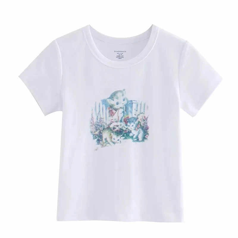 Women Kitten Print Cropped Cotton Tee Short Sleeved Cotton Crop T-shirt