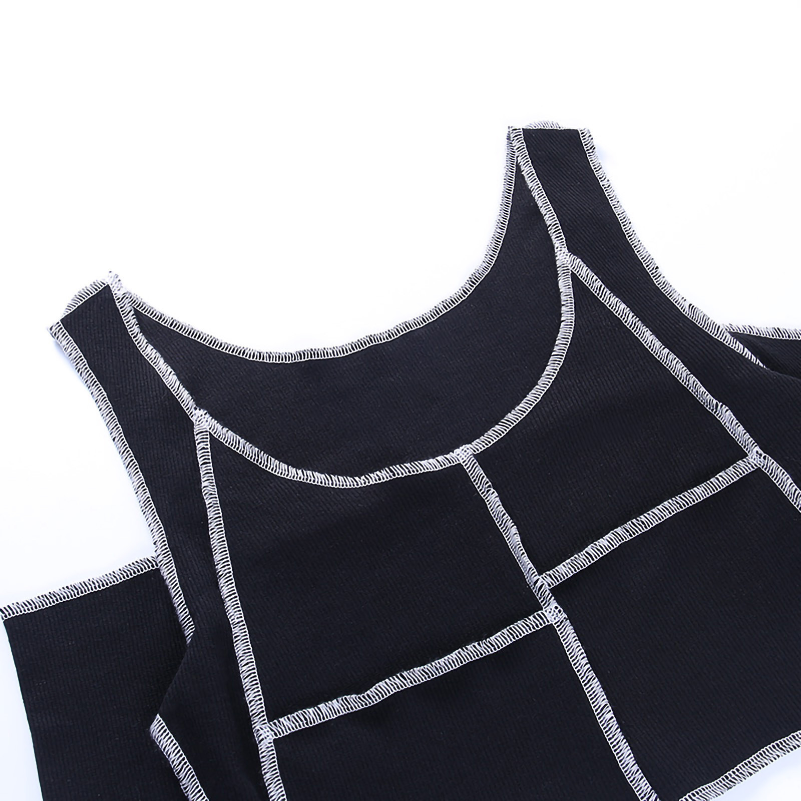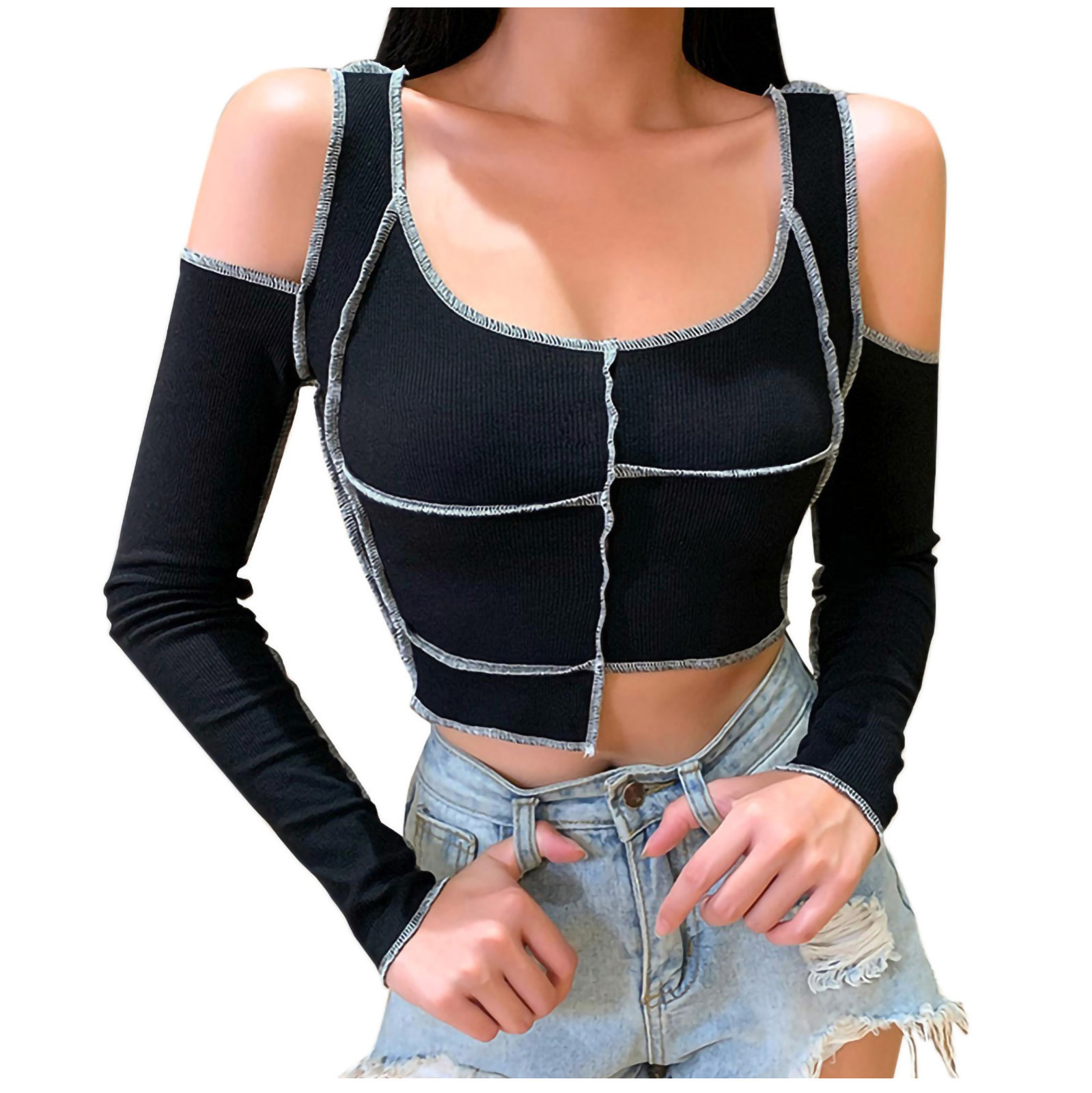 Women Long Sleeve Off Shoulder T-shirts Crop Tops Round Neck Irregular Stitching T-shirt Black Spring Hollow Out Tees