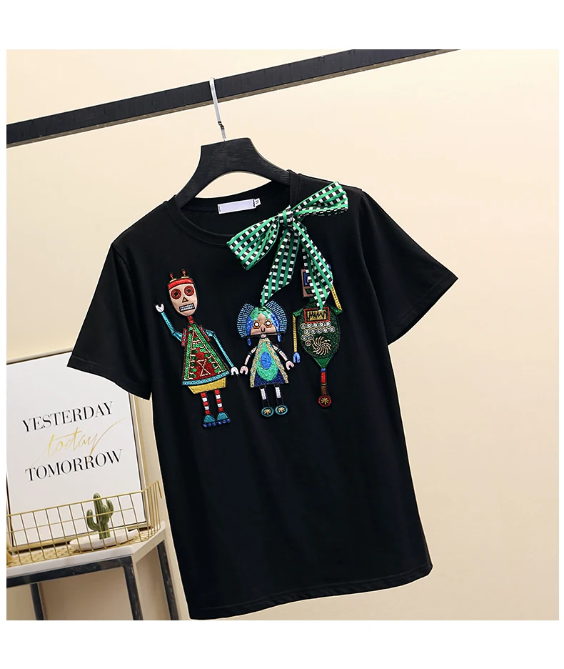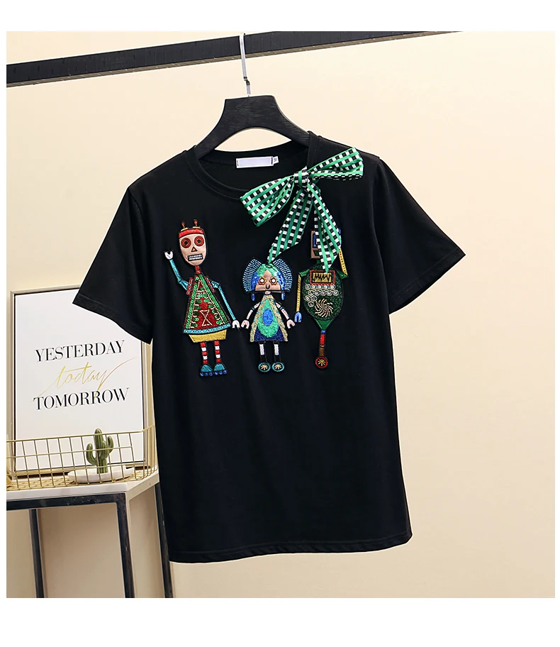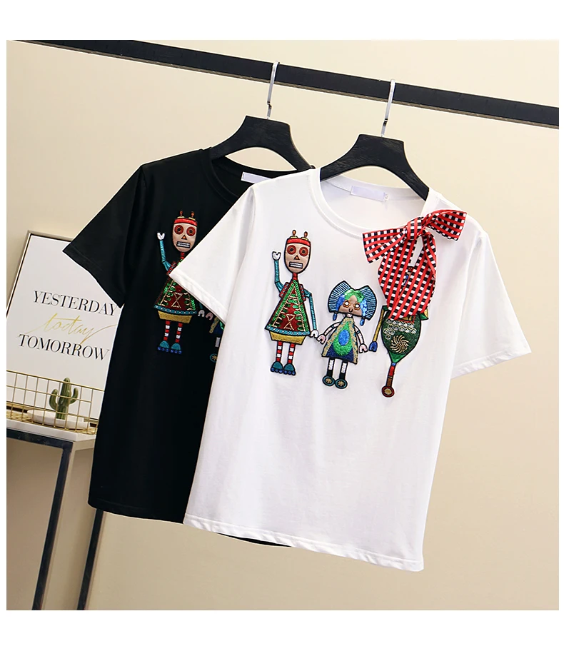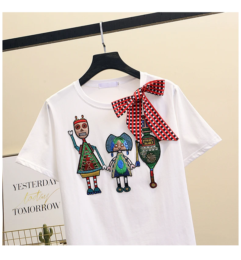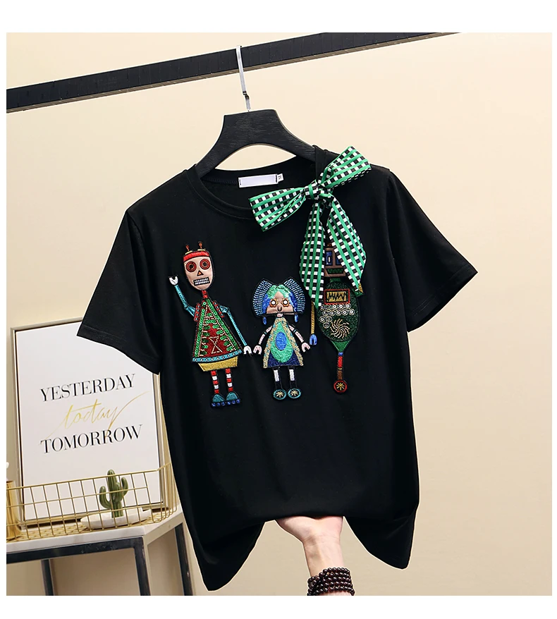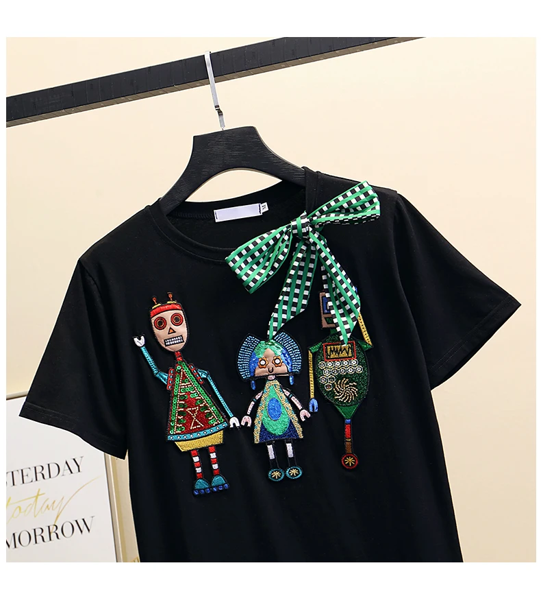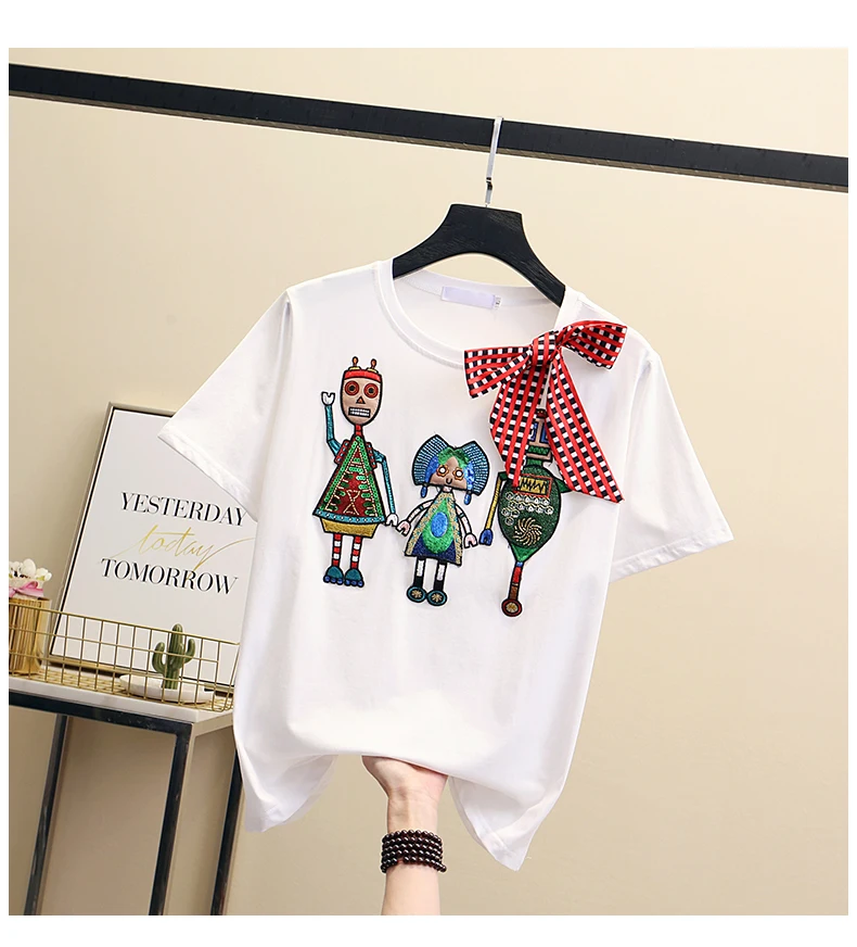 Women Luxurious Embroidery Sequins Cartoon T Shirt Lady O-neck Short Sleeve Bow Tee Shirt Cotton Casual Tshirt Summer Female Top