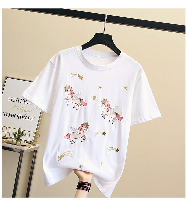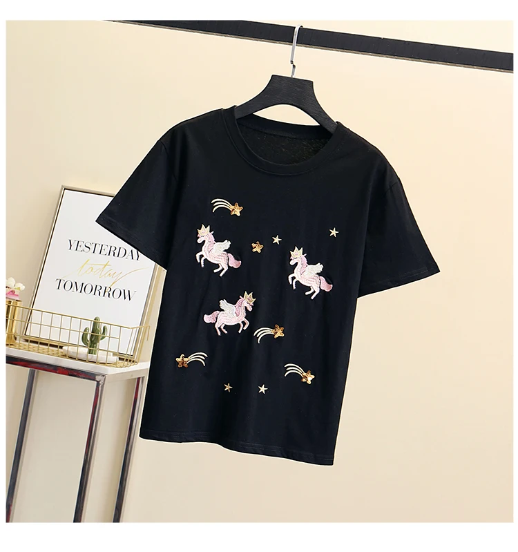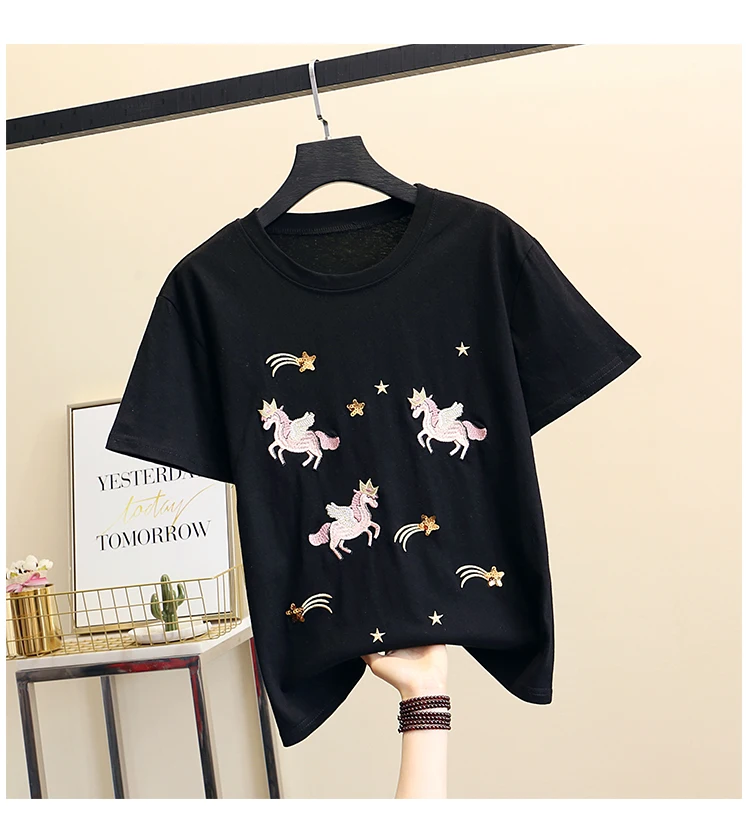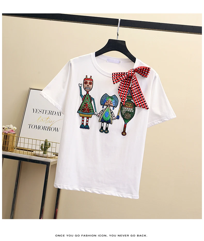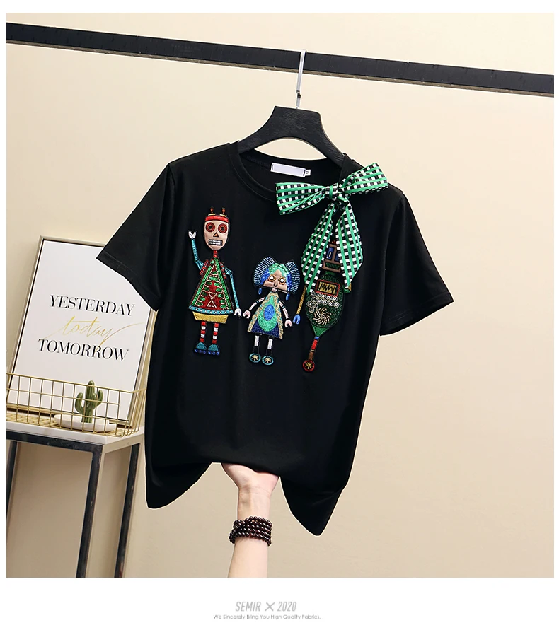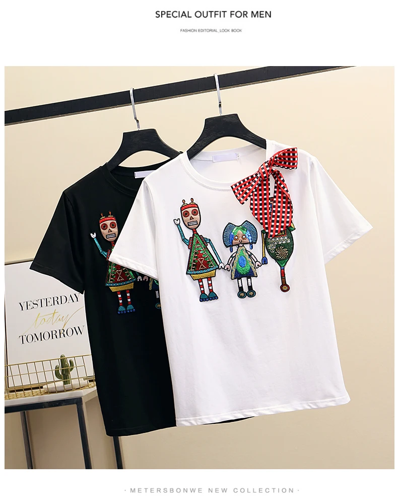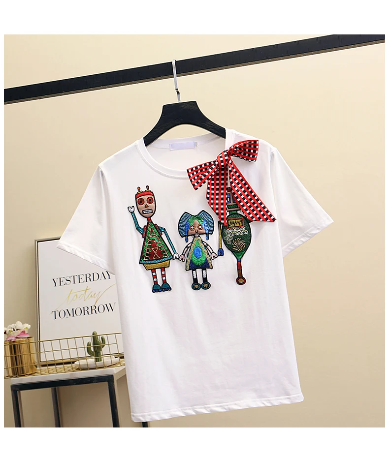 Women Luxurious Embroidery Sequins Cartoon T Shirt Lady O-neck Short Sleeve Bow Tee Shirt Cotton Casual Tshirt Summer Female Top