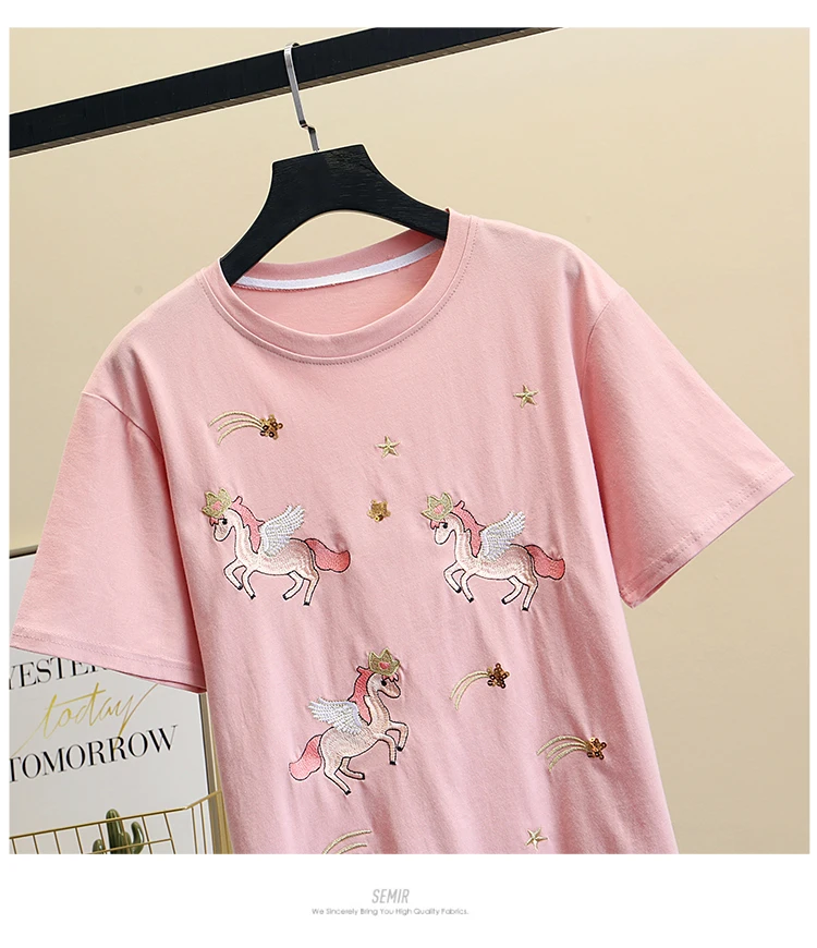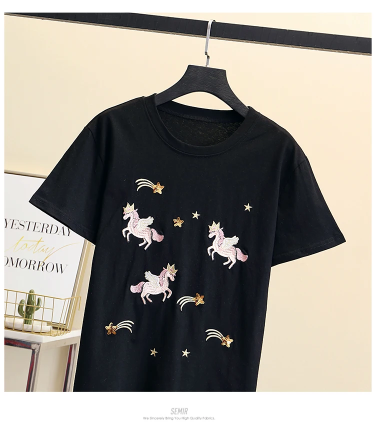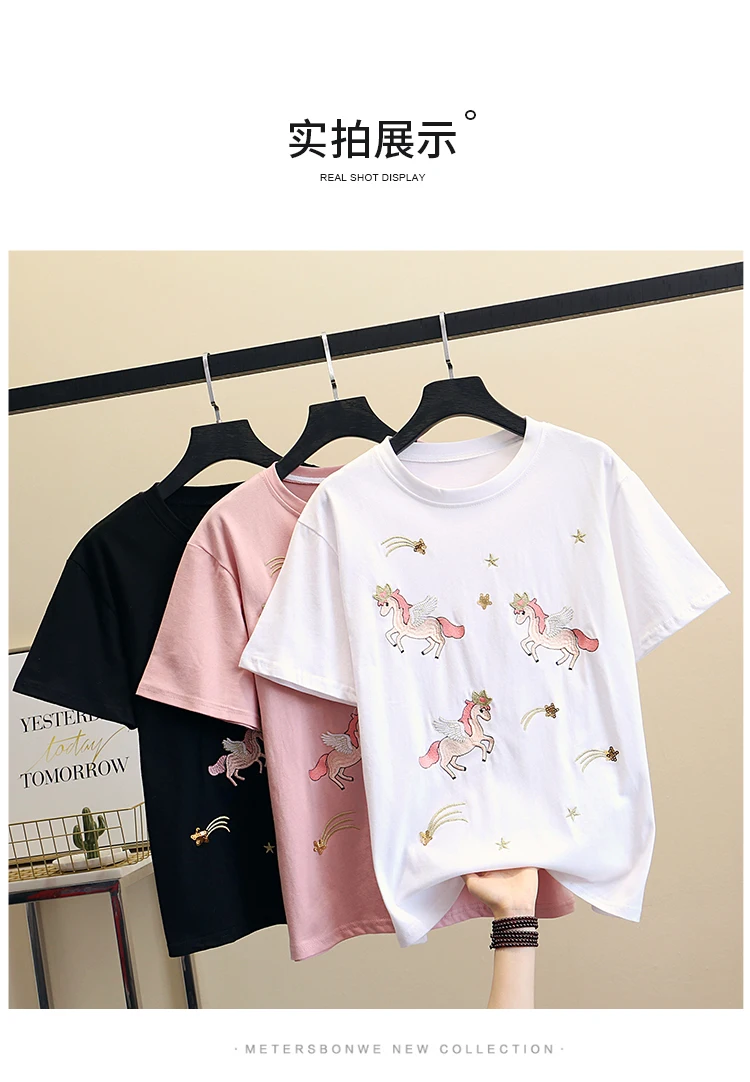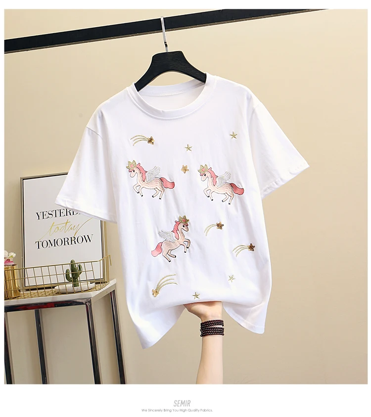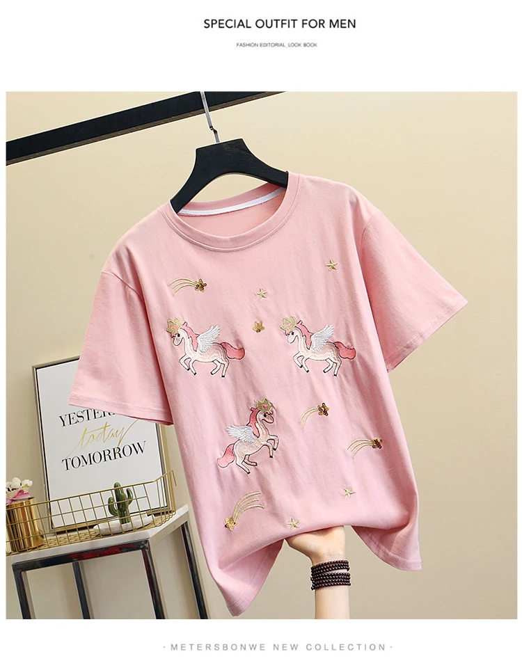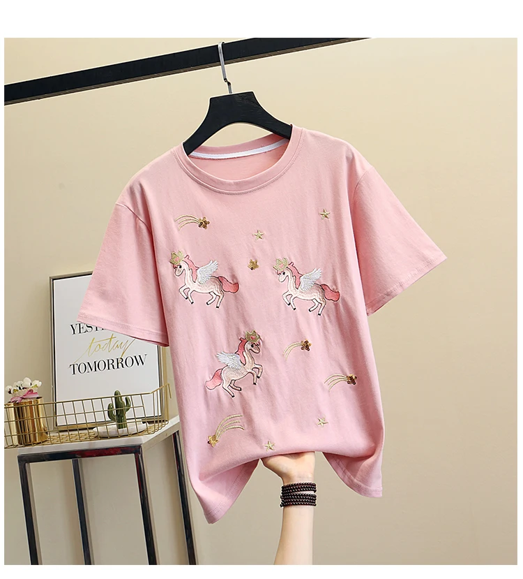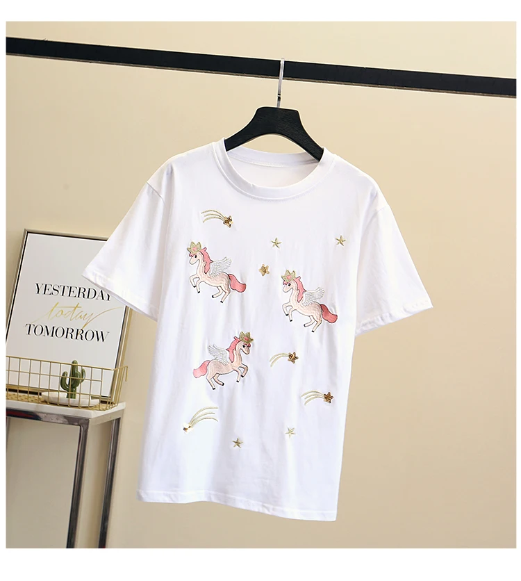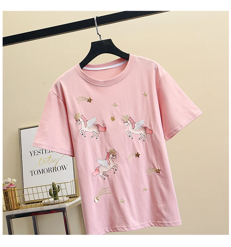 Women Luxurious Embroidery Sequins Cartoon T Shirt Lady O-neck Short Sleeve Bow Tee Shirt Cotton Casual Tshirt Summer Female Top