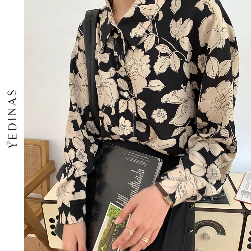 Yedinas Vintage Rose Print Shirt Women Elegant Blouse Female Long Sleeve Shirts Spring Casual Blouses Floral Womens Harajuku Top